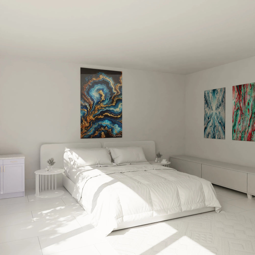 Cette création est le fruit d’une inspiration profonde, mêlant la force mystérieuse des océans et l’élégance intemporelle des œuvres abstraites. À travers ses ondulations et l’interaction subtile des couleurs, ce tableau évoque la beauté secrète et précieuse des géodes, symboles de richesse intérieure. Chaque détail a été pensé pour sublimer votre décor avec une pièce qui se fait à la fois silencieuse complice et véritable point focal.