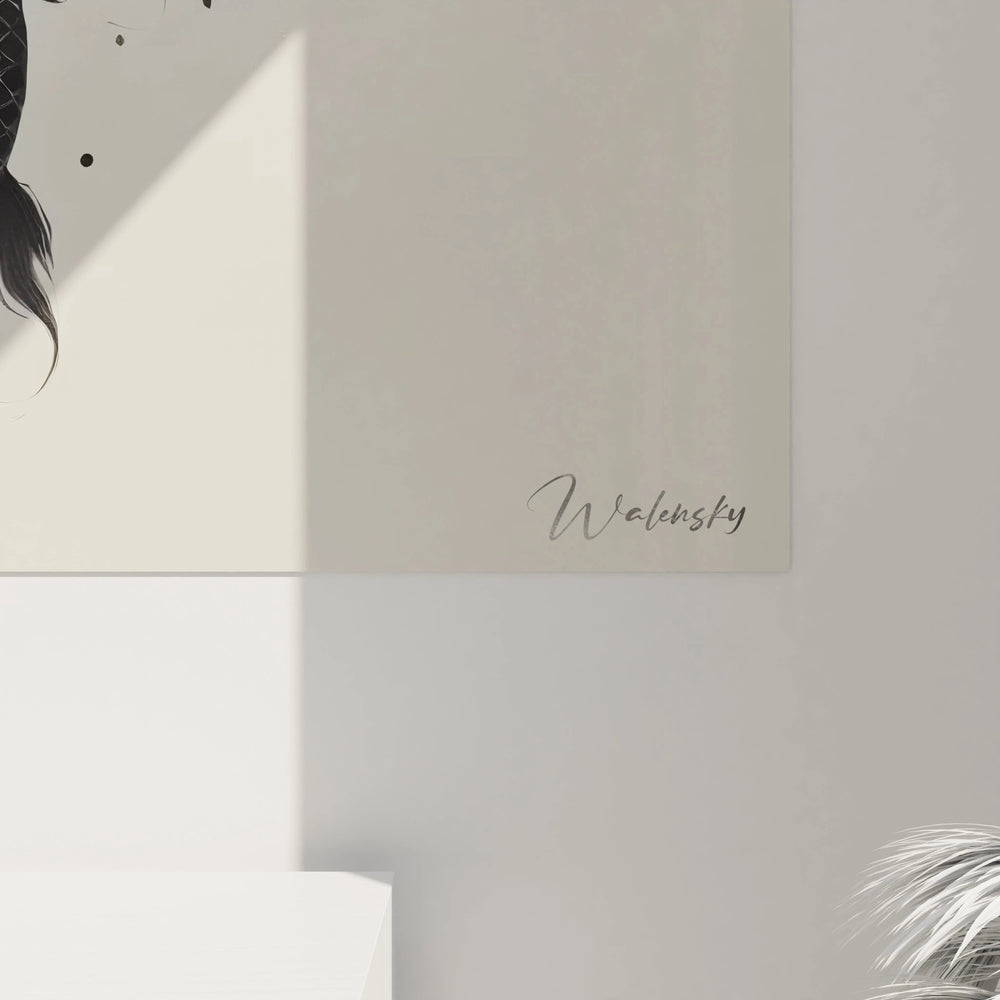 Ce tableau se marie idéalement avec des meubles noirs ou métalliques, renforçant son graphisme élégant. Ajoutez des touches argentées ou des objets blancs en céramique pour accentuer la pureté des contrastes. Autour, des textiles légers comme des rideaux flottants et des plantes aux formes épurées mettront en valeur la légèreté et la fluidité de cette œuvre unique.