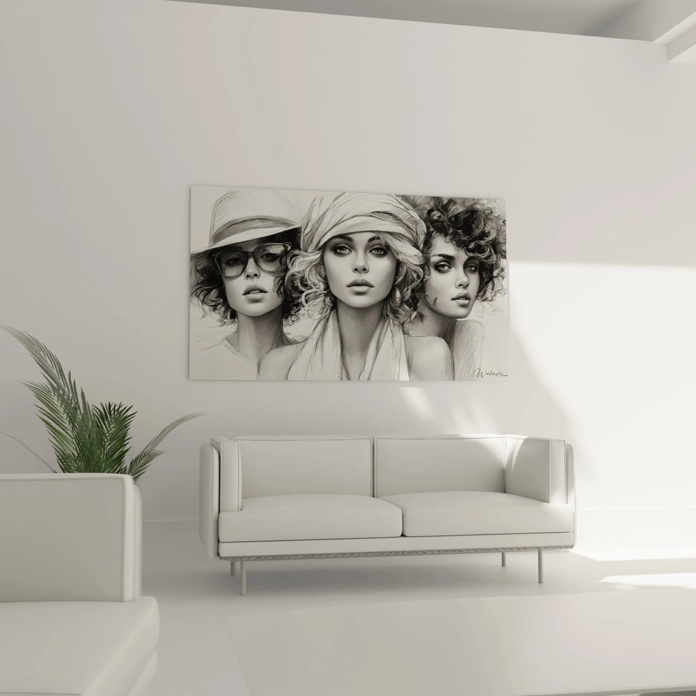 Ce tableau mural illustration de mode présente une composition artistique exceptionnelle mettant en scène trois portraits féminins d'une beauté saisissante. L'œuvre, réalisée dans un style graphique noir et blanc sophistiqué, capture l'essence de l'élégance moderne à travers des techniques de dessin maîtrisées. Au centre de la composition, une femme arbore un turban élégant drapé, orné de bijoux raffinés qui accentuent son regard intense et magnétique. Ses traits finement dessinés révèlent une beauté intemporelle, tandis que ses boucles d'oreilles délicates ajoutent une touche de luxe à l'ensemble.