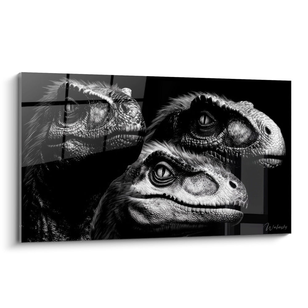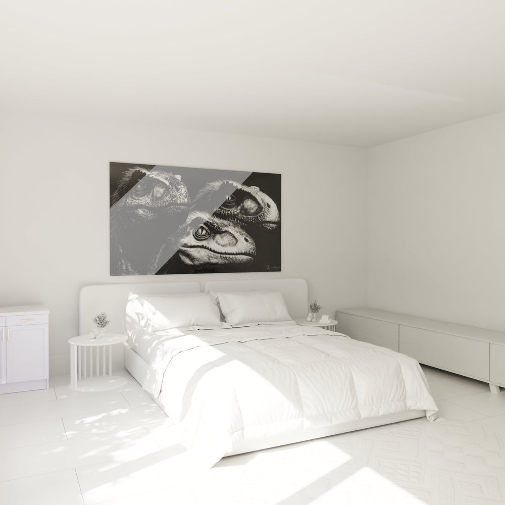 Ce tableau mural dinosaures présente une composition saisissante de trois créatures préhistoriques aux détails exceptionnels. L'artwork dinosaure met en scène des rapaces aux caractéristiques reptiliennes prononcées, avec leurs écailles finement ciselées et leurs yeux perçants qui captent immédiatement l'attention. Chaque dinosaure rapace est représenté avec une précision anatomique remarquable, révélant des textures de peau réalistes et des expressions faciales distinctes. La technique de rendu en noir et blanc confère à cette décoration murale dinosaure une dimension artistique intemporelle, où les jeux d'ombres et de lumières subliment chaque détail. Les trois créatures semblent engagées dans une interaction silencieuse, leurs regards dirigés dans différentes directions créant une dynamique visuelle captivante. Cette toile dinosaure préhistorique témoigne d'un travail artistique minutieux, où chaque plume proto-aviaire et chaque ride cutanée contribuent au réalisme saisissant de l'ensemble. L'art mural dinosaure transforme l'espace de vie en véritable galerie paléontologique, offrant une fenêtre fascinante sur le monde jurassique disparu.