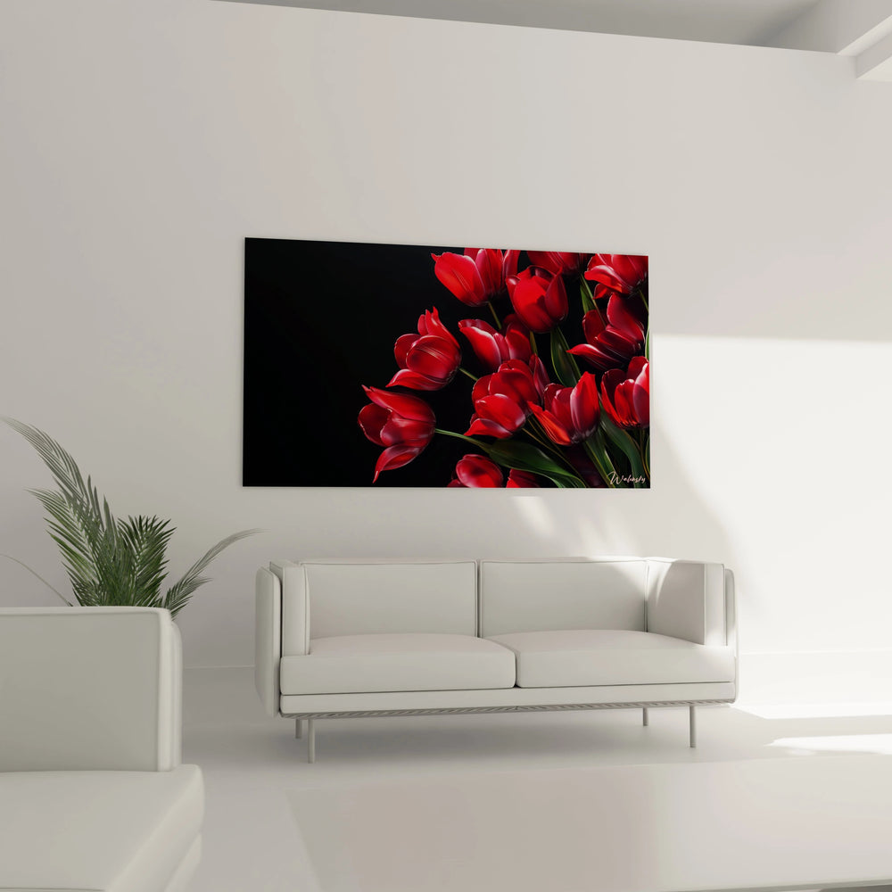 Plus qu’une simple décoration murale, ce tableau est une ode à la puissance émotionnelle que la nature peut transmettre. La richesse du rouge intense évoque chaleur, énergie et vitalité, tandis que le noir mystérieux apporte toute la sophistication nécessaire pour valoriser ce spectacle floral. Les nuances de vert des tiges insufflent une fraîcheur naturelle, équilibrant parfaitement l’ensemble pour inviter à la contemplation et à l’évasion dans un jardin imaginaire.