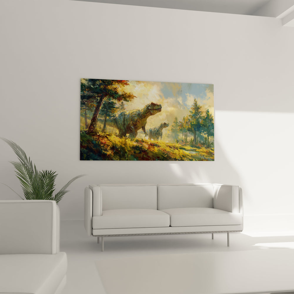 La palette chromatique de ce tableau dinosaure artistique s'articule autour de tons terreux chaleureux, dominés par des ocres dorés, des verts profonds et des bruns riches qui évoquent la majesté de la nature préhistorique. Les jeux de lumière créent des contrastes dramatiques, symbolisant la dualité entre la beauté sauvage et la puissance destructrice de ces géants du passé. Cette harmonie colorielle confère à l'œuvre une atmosphère à la fois mystérieuse et majestueuse, parfaite pour une décoration murale dinosaure sophistiquée.