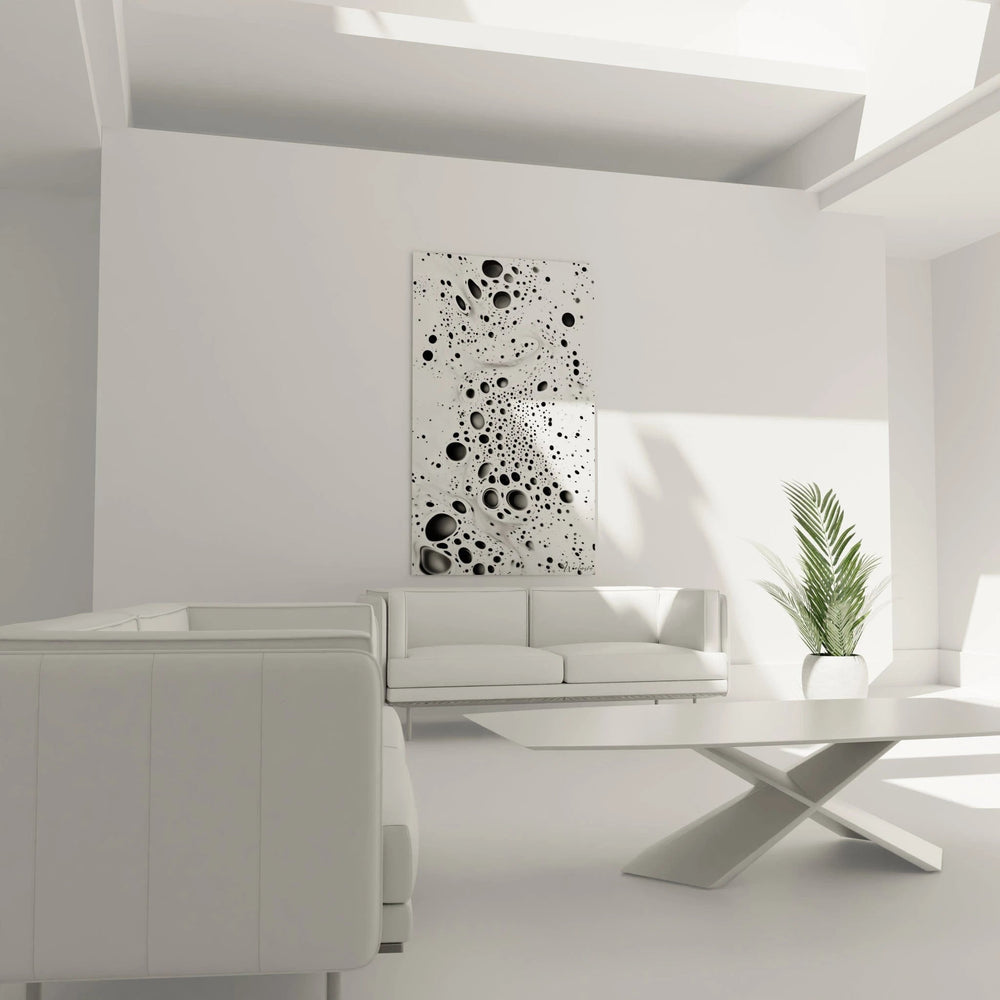 Ses motifs tachetés, d’un noir intense sur fond blanc immaculé, évoquent la danse organique d’une vie invisible à l’œil nu. Chaque forme semble vibrer, offrir un dialogue silencieux entre complexité et pureté. Suspendu dans votre espace, ce tableau devient plus qu’une simple décoration : il devient une source d’inspiration et de calme, insufflant à votre intérieur une atmosphère élégante et raffinée.