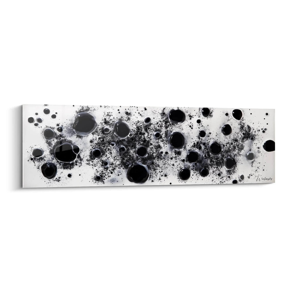 La composition de ce tableau éclaboussures noir et blanc révèle une organisation spatiale fascinante où les éléments semblent distribués selon une logique organique. Les cercles de tailles variées créent un rythme visuel qui guide l'œil à travers l'ensemble de l'œuvre. La perspective horizontale amplifie l'effet de dispersion, donnant l'impression que les éclaboussures s'étendent au-delà des limites du cadre. Cette art mural éclaboussures utilise l'espace négatif blanc comme un élément structurant majeur, permettant aux formes noires de respirer et de créer des zones de tension visuelle. L'équilibre entre concentration et dispersion génère une dynamique particulière qui maintient l'attention du spectateur en constant mouvement d'exploration.