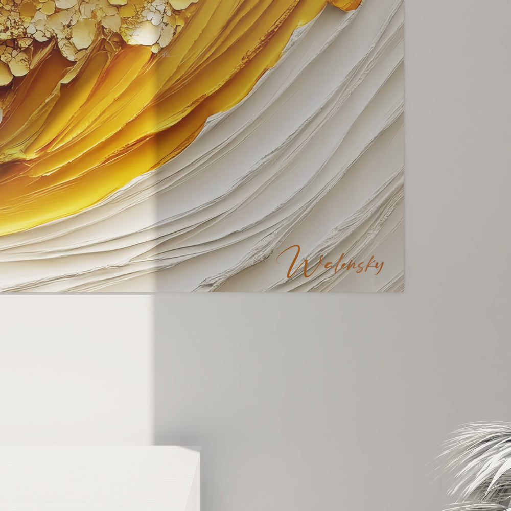 La symbolique de l'or dans cette œuvre évoque la prospérité, l'illumination spirituelle et la transformation. La sphère cristalline représente la pureté et la clarté de l'esprit, créant un contraste saisissant avec la dynamique de la vague. Les tons dorés se déclinent du champagne au bronze profond, tandis que les nuances neutres apportent équilibre et sérénité à l'ensemble.
