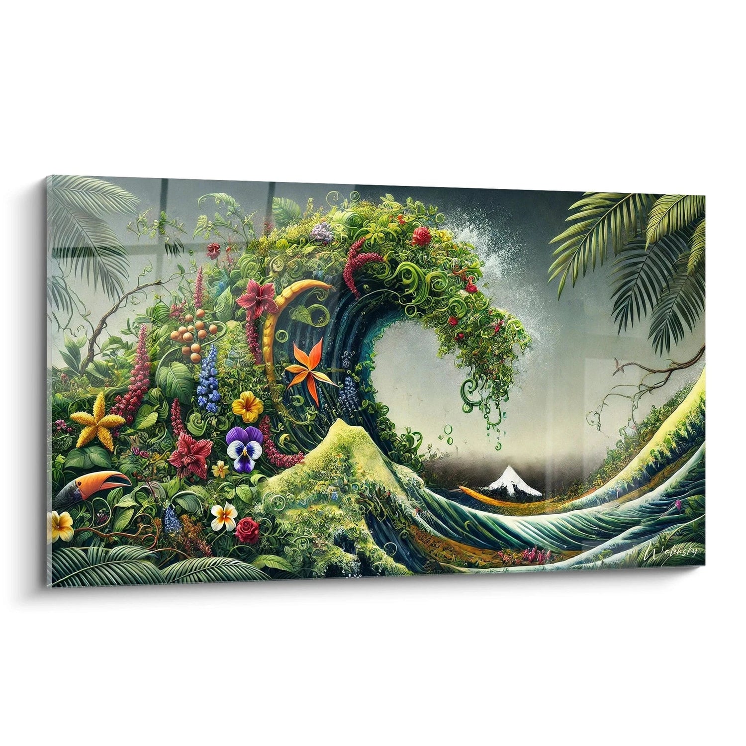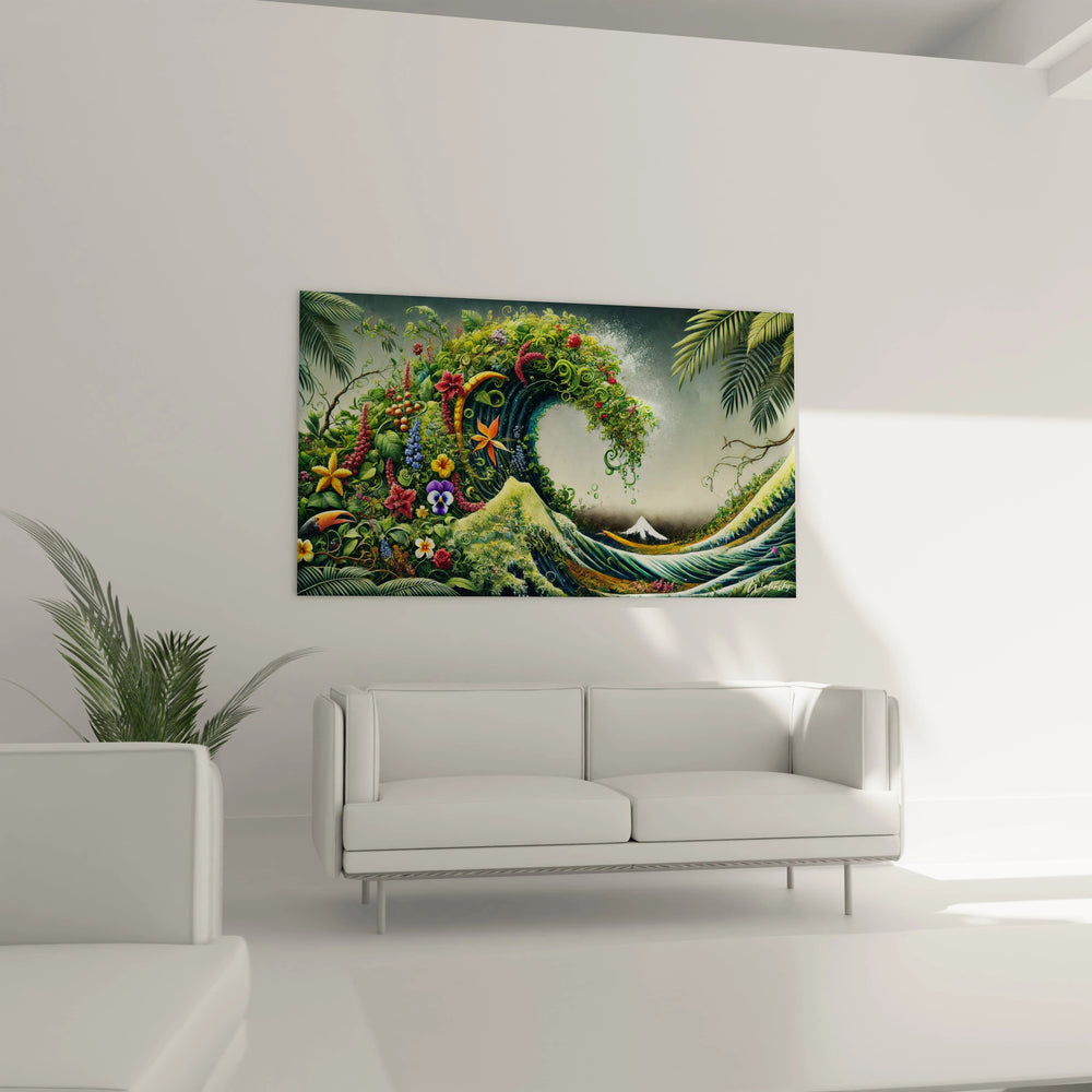 Cette composition splendide révèle toute la puissance d’une vague en mouvement perpétuel, son énergie capturée avec une délicatesse rare. Entre ses flots tourbillonnants, des motifs floraux exotiques s’épanouissent, signant une résilience naturelle et une élégance captivante. Vous ressentez presque le murmure de l’eau mêlé à la fraîcheur des feuilles, dans un ballet visuel qui apaise et stimule simultanément.