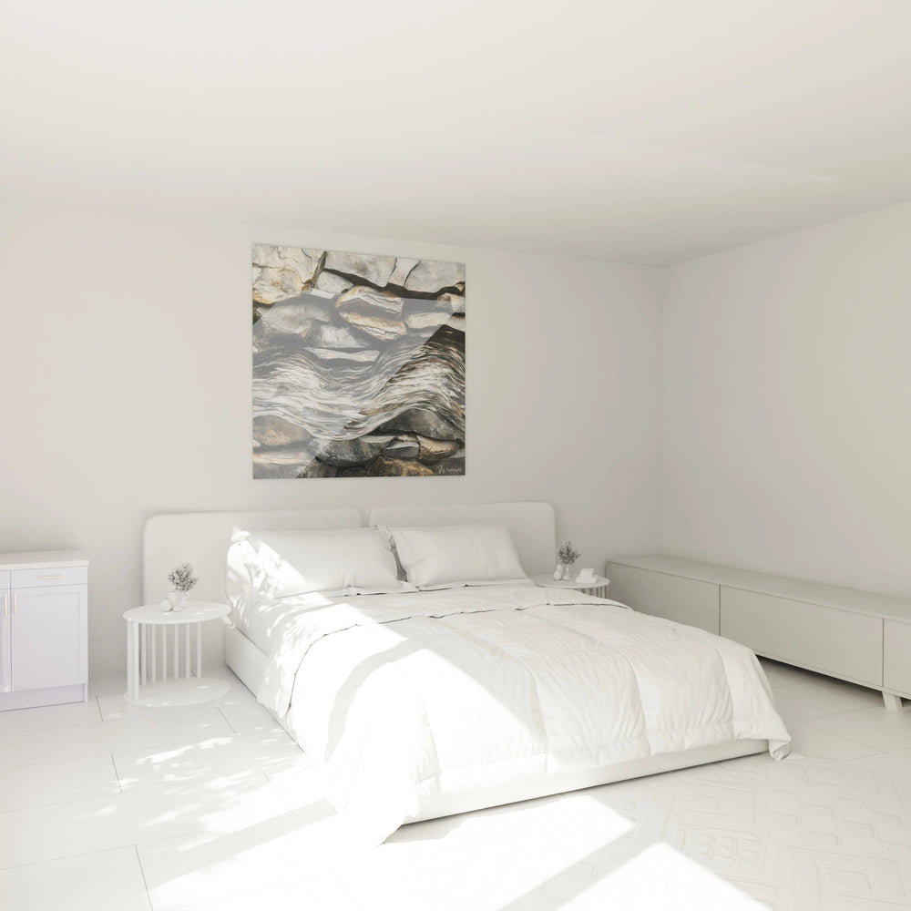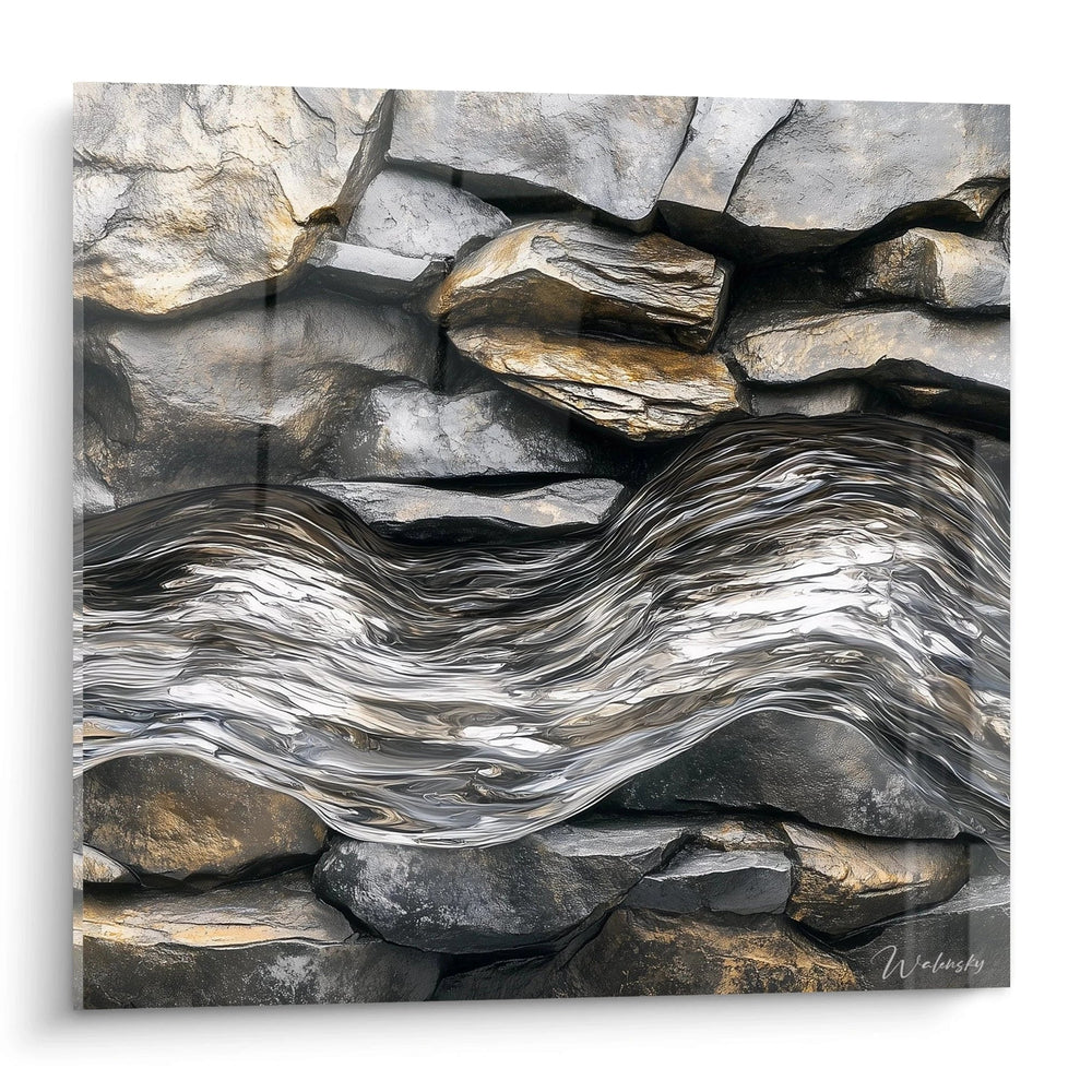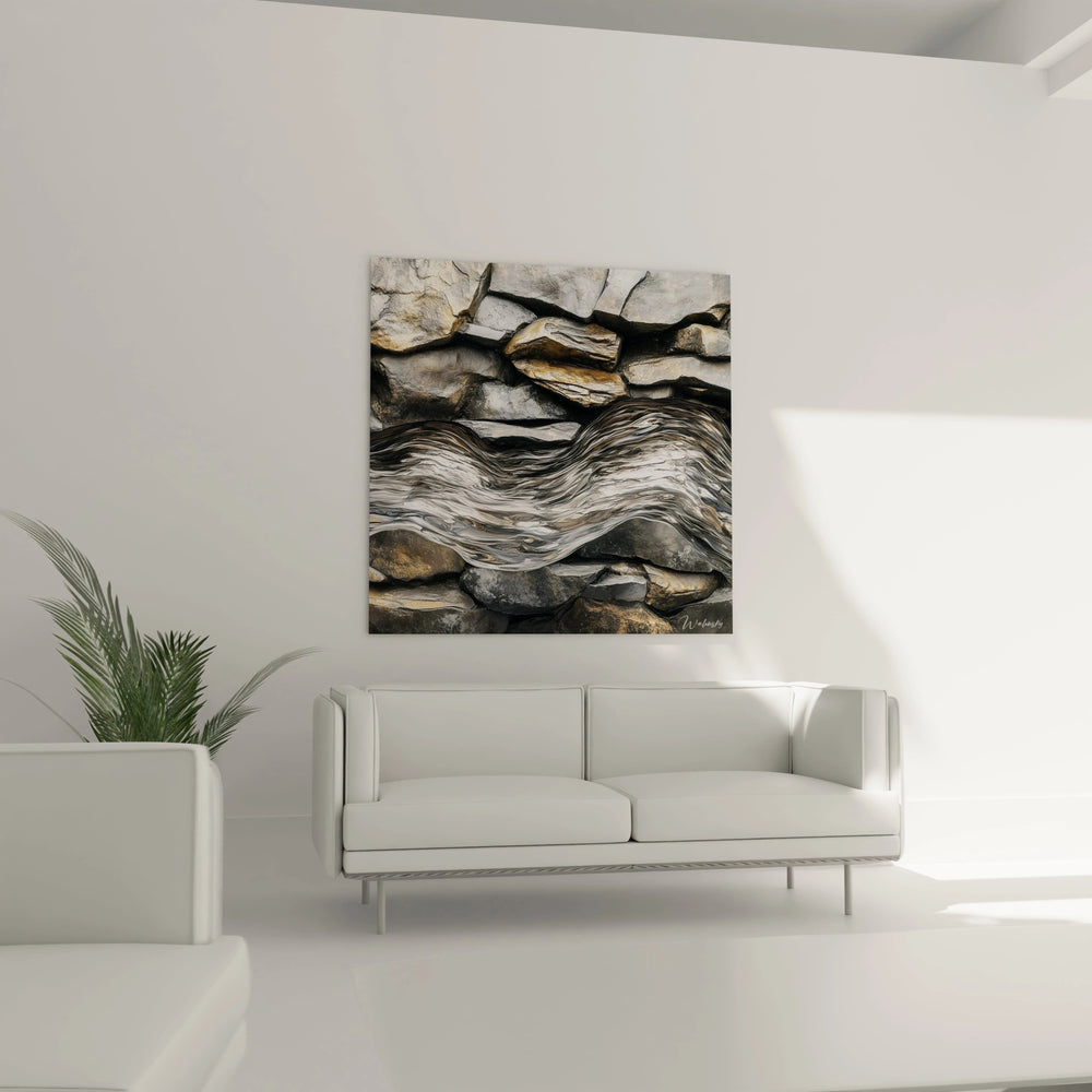 La façon dont l'élément fluide semble à la fois contenu par les roches et capable de les traverser crée une narration visuelle ambiguë et fascinante. Cette décoration murale minérale joue sur notre perception du solide et du liquide, du stable et du mouvant, créant une expérience visuelle qui défie nos catégories habituelles et nous invite à reconsidérer notre compréhension des matières et des états.