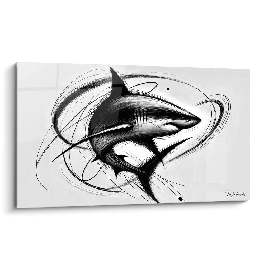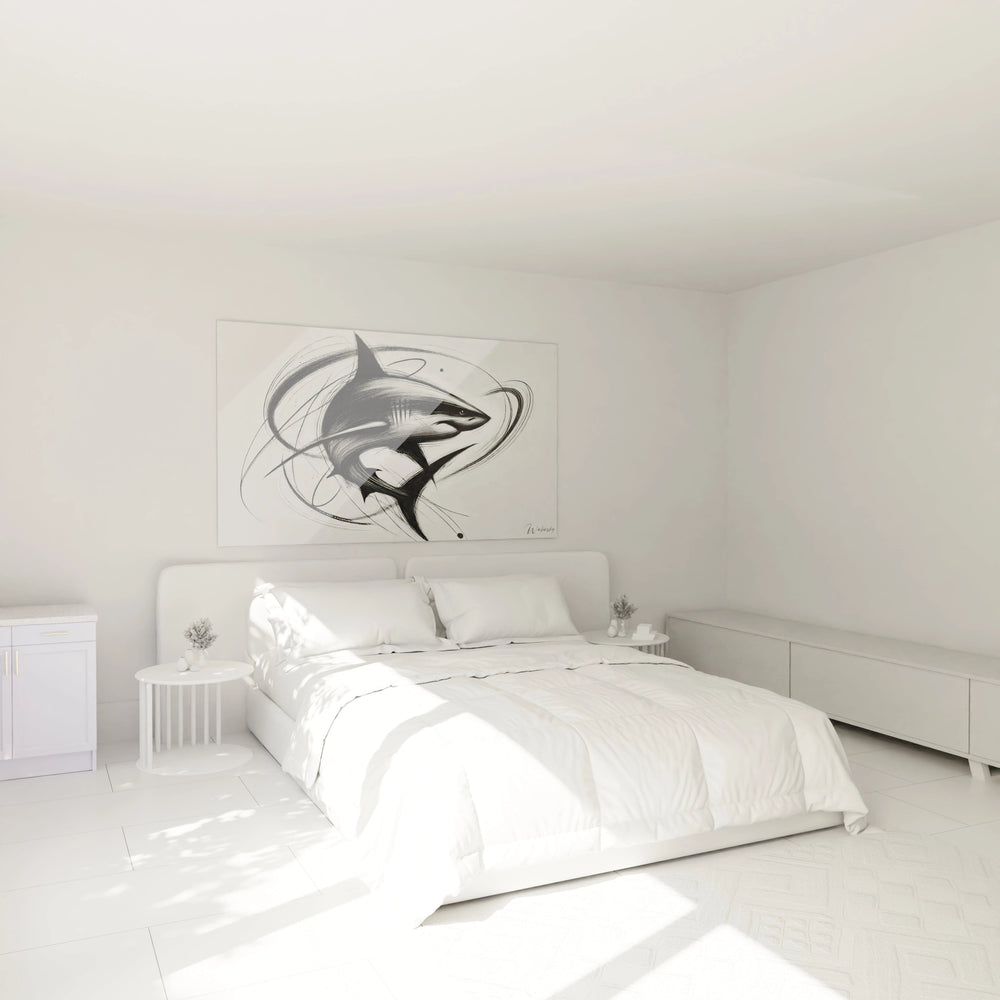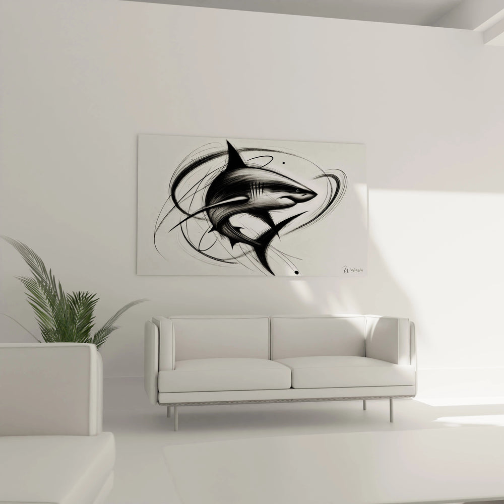 Découvrez la poésie silencieuse d’un requin évoluant avec grâce au cœur des tourbillons océaniques. Les lignes noires vives et précises évoquent la douceur du mouvement des vagues, tandis que l’énergie intense du sujet se fait palpable. Ce contraste crée une atmosphère hypnotique où la force tranquille rencontre la légèreté, transformant votre pièce en un havre à la fois audacieux et élégant.