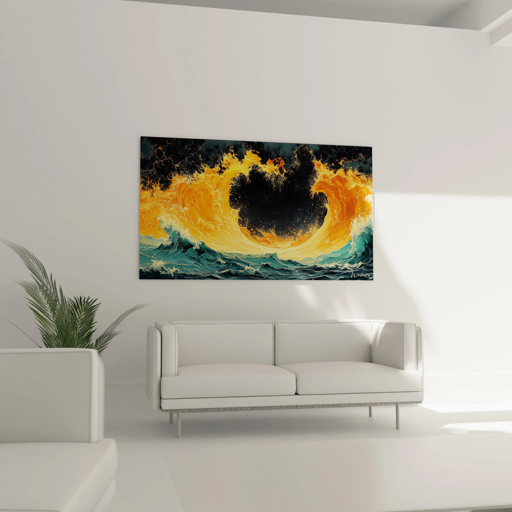 Ce tableau mer captivant représente une fusion spectaculaire entre océan tumultueux et explosion solaire. Les vagues turquoise s'entrelacent avec des flammes dorées dans une composition circulaire saisissante. L'œuvre présente un contraste dramatique entre le noir profond du centre et l'éclat orangé qui l'entoure, créant un effet de portail cosmique au-dessus d'une mer agitée. La précision des détails dans ce tableau mer révèle la tension harmonieuse entre deux forces primordiales.