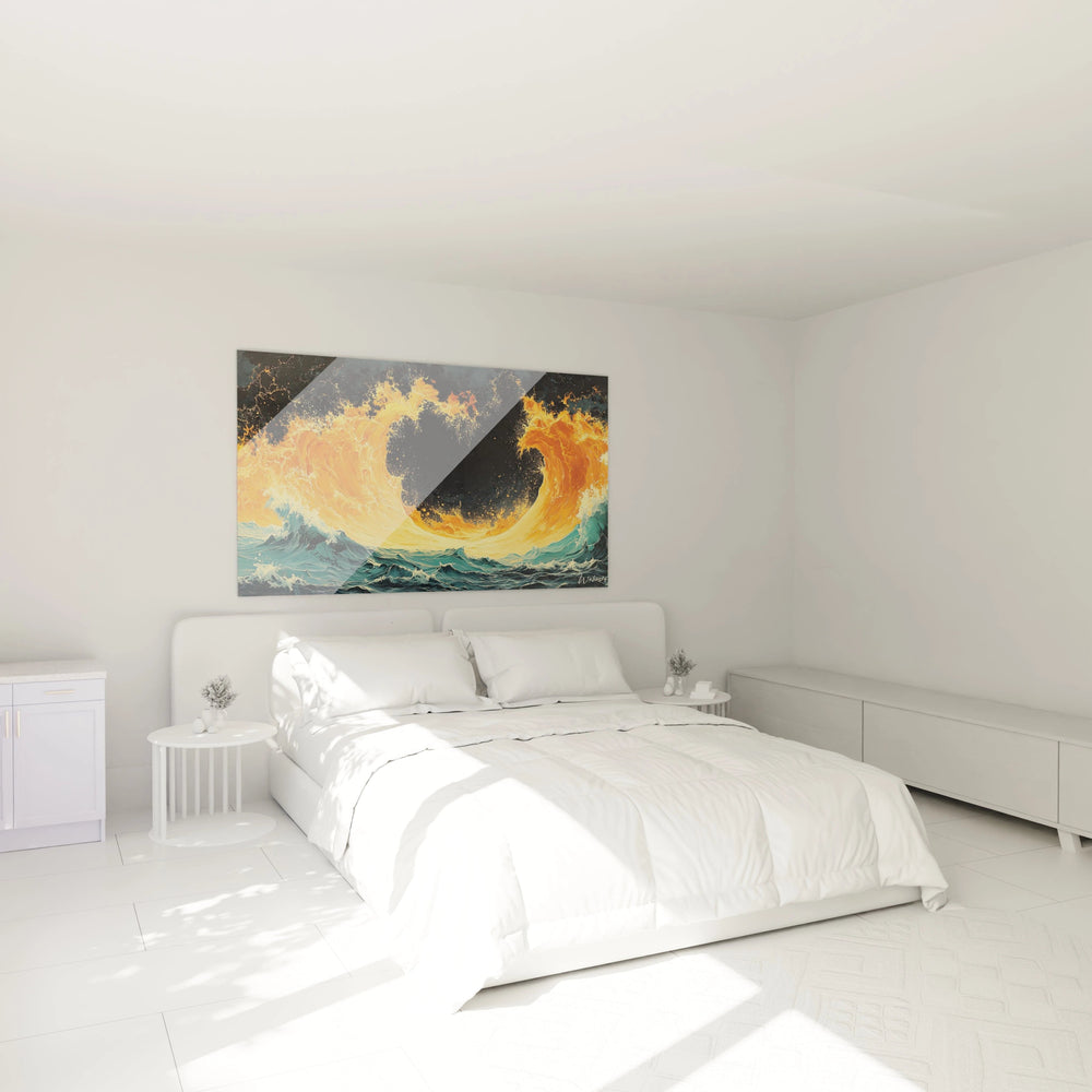 Cette œuvre est bien plus qu’une simple image : elle raconte une rencontre mystique avec les éléments. Vous ressentirez, en posant le regard dessus, le mouvement perpétuel des vagues et leur énergie brute, tout en étant enveloppé par la douceur réconfortante des teintes dorées et orangées. Chaque détail évoque ce moment suspendu où la mer danse avec le feu, forgeant une atmosphère d’une profondeur presque hypnotique.
