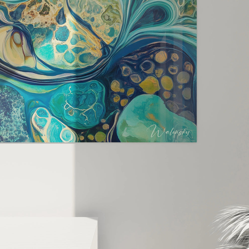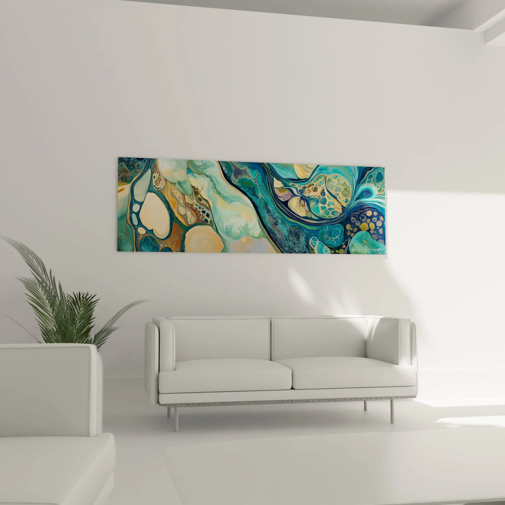 Né de la passion pour la beauté naturelle des océans et la pureté des éléments, ce tableau incarne la magie des vagues cristallines reflétant la lumière. Chaque détail abstrait est pensé pour offrir une expérience visuelle immersive, mêlant texture et profondeur, qui évolue selon l’éclairage ambiant et votre angle de vue.