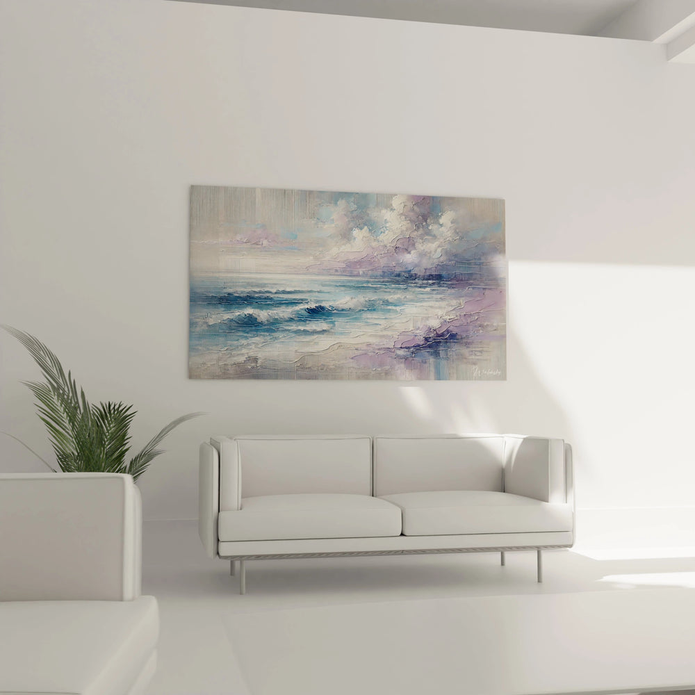 Chaque détail de cette œuvre fait vibrer vos sens : les nuances délicates de violet et de bleu s’entrelacent comme une caresse sur la peau, tandis que les courbes des vagues semblent onduler sous vos yeux. Ce tableau n'est pas simplement une image ; c’est une expérience immersive, une invitation à plonger dans une ambiance relaxante qui apaise l’esprit et invite au rêve.
