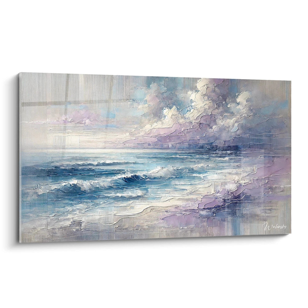 Sa texture subtilement travaillée ajoute une profondeur élégante, offrant une sensation tactile qui stimule le regard, explorant sans fin la danse entre le mouvement énergique des vagues et la douceur enveloppante du ciel lavande.