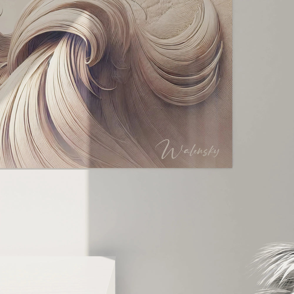 Les courbes fluides et raffinées donnent vie à une atmosphère apaisante, où la texture soyeuse de la crinière évoque une sensation tactile presque palpable. La palette de tons soigneusement choisie - beige, or et gris doux - rappelle le sable chaud, illuminé par des reflets dorés, instaurant une ambiance chaleureuse et enveloppante dans votre intérieur.