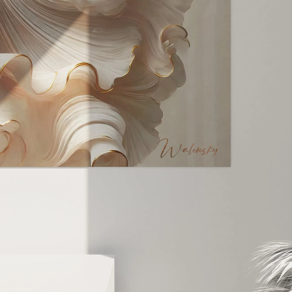 Conçu pour transformer votre intérieur en un havre de paix, ce tableau vous transporte au cœur d’un univers aquatique apaisant. Les teintes douces de blanc, beige et or s’entrelacent pour envelopper votre espace d’une lumière chaleureuse et subtile, créant une atmosphère où le temps semble ralentir.