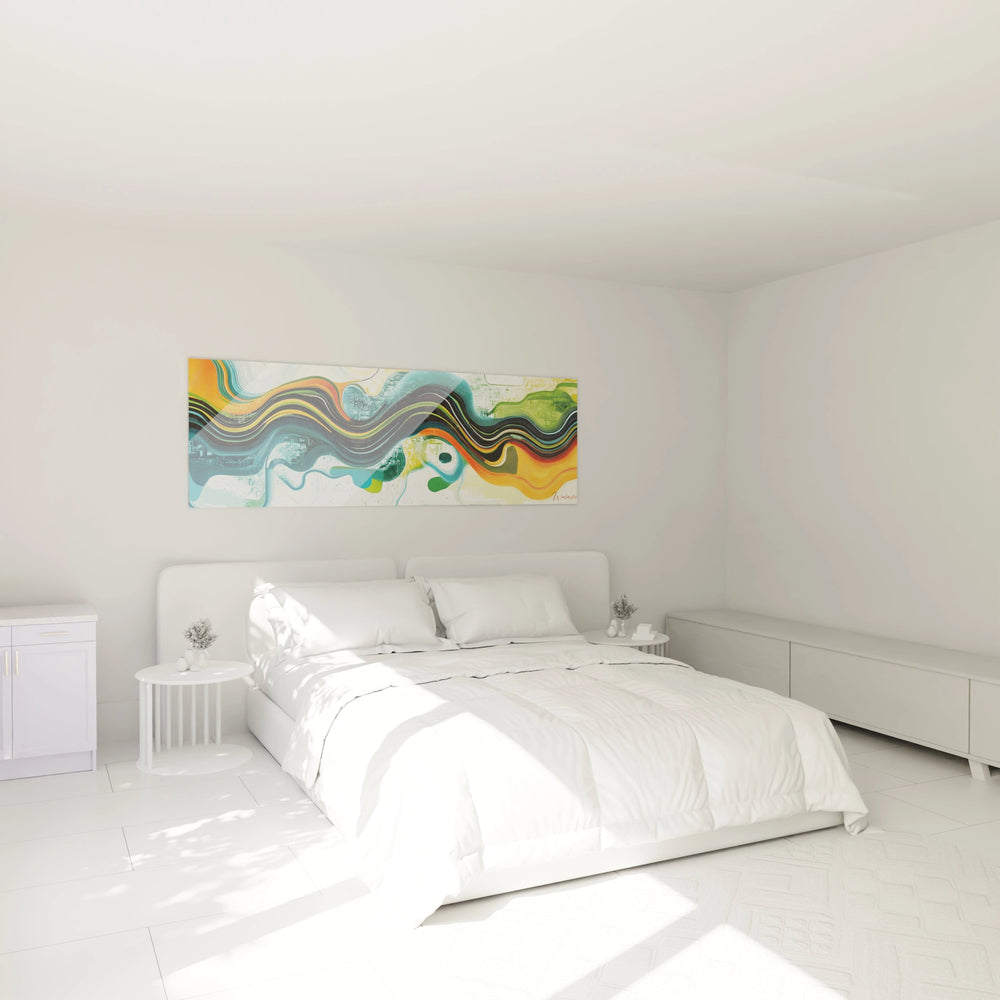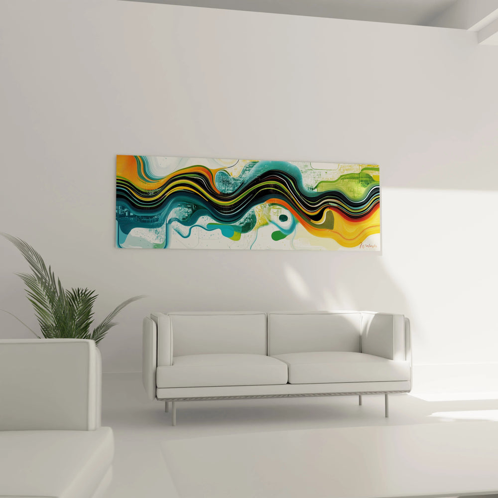 Ce tableau vagues abstraites captive immédiatement par sa composition horizontale panoramique où des lignes ondulantes s'entrelacent avec fluidité et harmonie. L'œuvre présente un mouvement dynamique continu, créant une sensation de flux perpétuel à travers des couches superposées de couleurs vibrantes. Les ondulations créent un rythme visuel saisissant qui guide le regard d'un bout à l'autre de la composition, tandis que la juxtaposition des teintes chaudes et froides génère une tension visuelle fascinante.