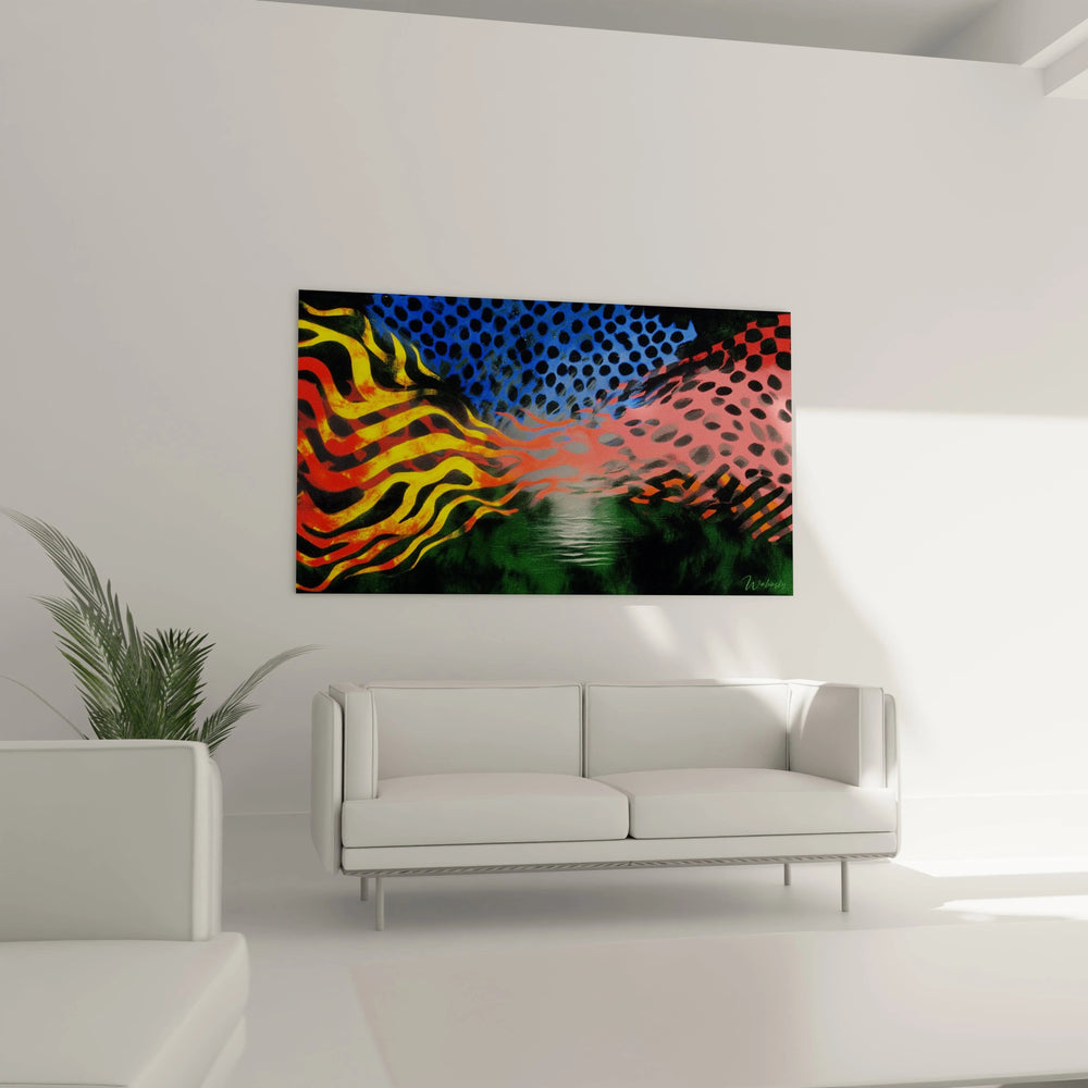 Cette décoration murale vagues optiques se distingue par son caractère hypnotique irrésistible. L'effet de mouvement perpétuel créé par l'interaction entre les courbes fluides et les motifs ponctuels génère une expérience visuelle immersive unique. Le tableau vagues optiques psychédélique exploite les limites de la perception humaine pour créer des illusions de profondeur et de mouvement qui semblent défier les lois physiques. Les transitions chromatiques créent des effets de vibration optique particulièrement intenses aux points de rencontre entre les différentes zones colorées. Aucun autre élément décoratif ne peut reproduire cette sensation de flux énergétique constant.