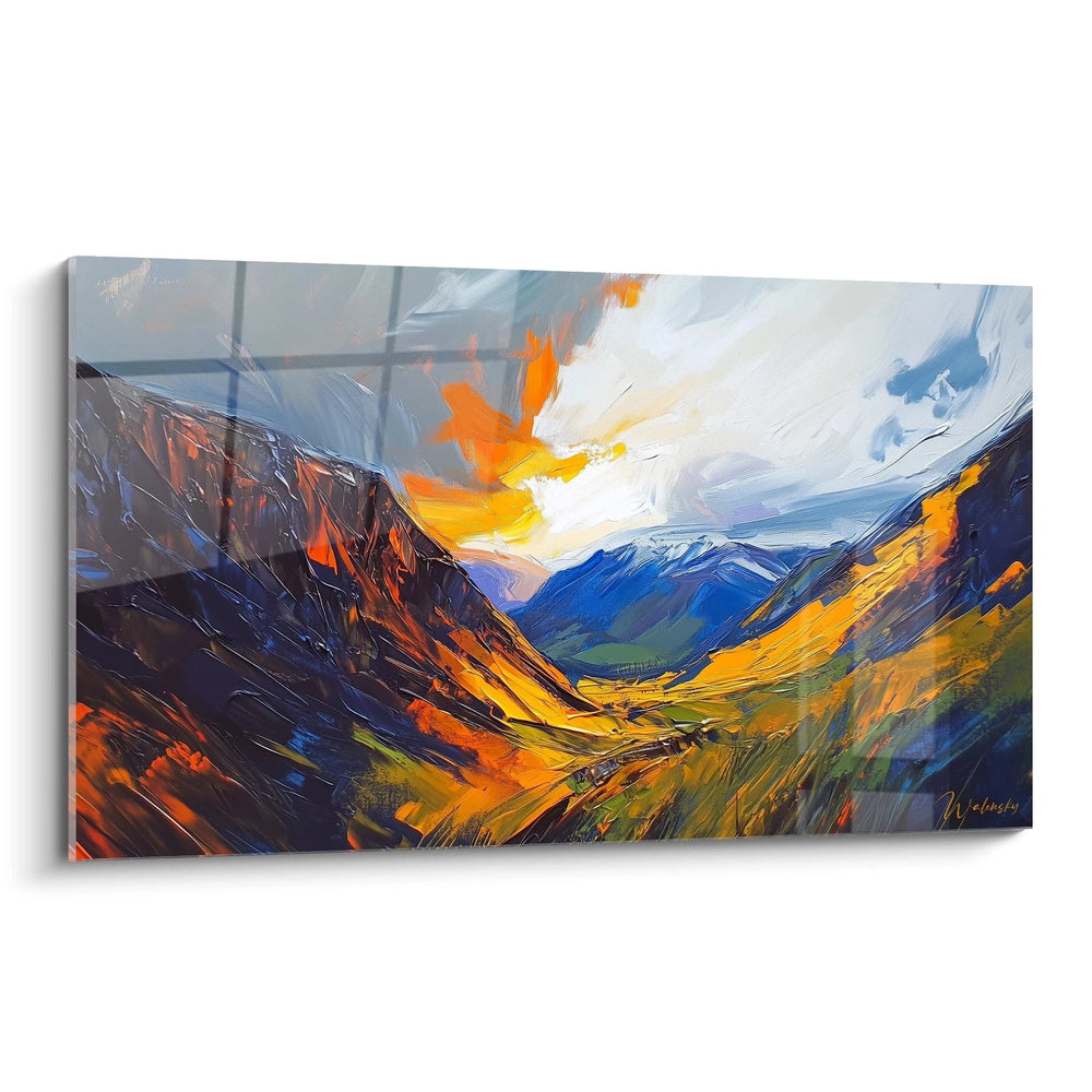 La composition de ce tableau montagne coloré s'organise autour d'une vallée centrale qui guide le regard vers l'horizon. Les montagnes encadrent l'espace de manière symétrique, créant un effet de profondeur remarquable. Le point focal se situe au centre supérieur, où le ciel s'embrase de couleurs chaudes qui se reflètent sur les sommets. L'utilisation audacieuse de l'espace négatif dans le ciel permet aux montagnes d'apparaître encore plus imposantes. Cette décoration murale montagne exploite brillamment les lignes diagonales qui convergent vers le centre, créant un mouvement visuel dynamique qui capture l'œil.