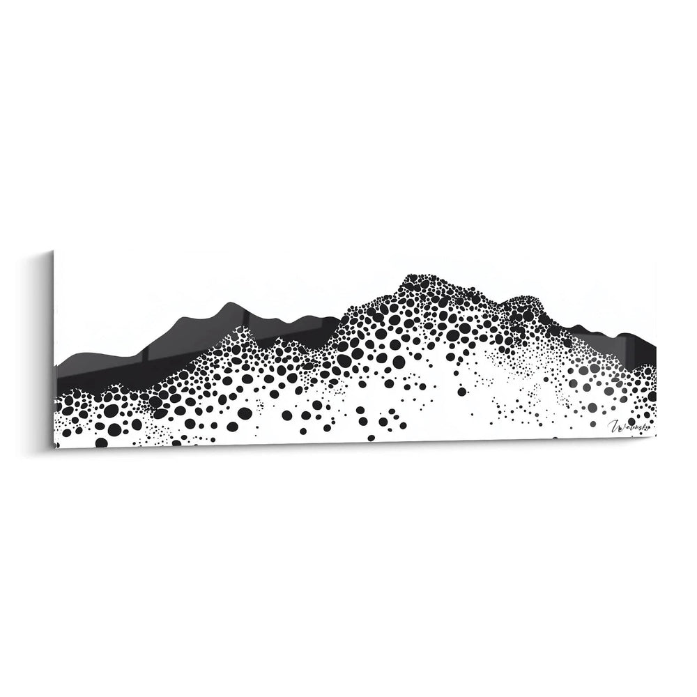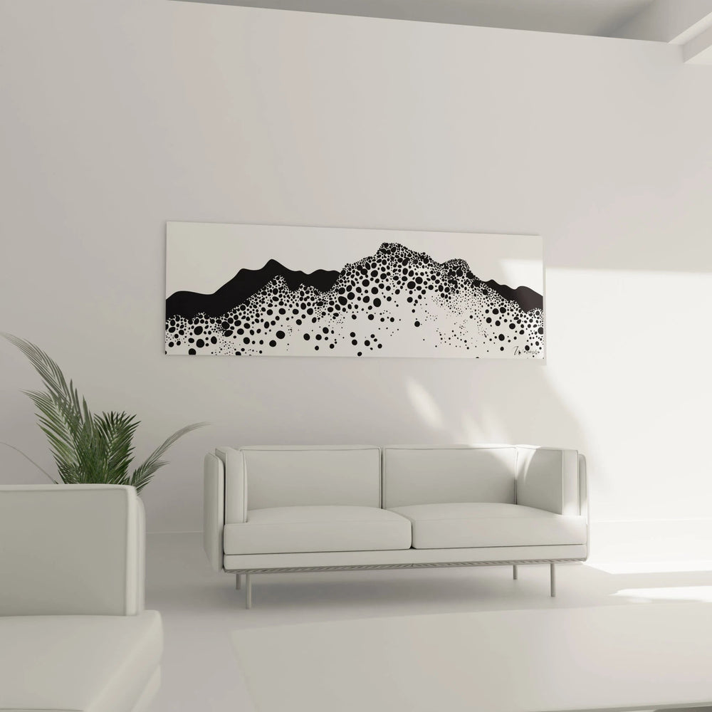 La composition de cette œuvre montagne suit une progression horizontale marquée par trois zones distinctes. Le tiers supérieur présente les silhouettes montagneuses aux contours nets et fluides, créant une ligne d'horizon dynamique. La partie centrale révèle une transition graduelle où les points noirs commencent à apparaître de manière éparse. Le tiers inférieur concentre la densité maximale de points, créant un effet de dégradé naturel. Cette art mural montagne utilise l'espace de manière équilibrée, avec une perspective panoramique qui invite le regard à parcourir l'ensemble de la composition. Les proportions respectent la règle des tiers, plaçant la ligne de crête dans la zone optimale pour l'impact visuel.