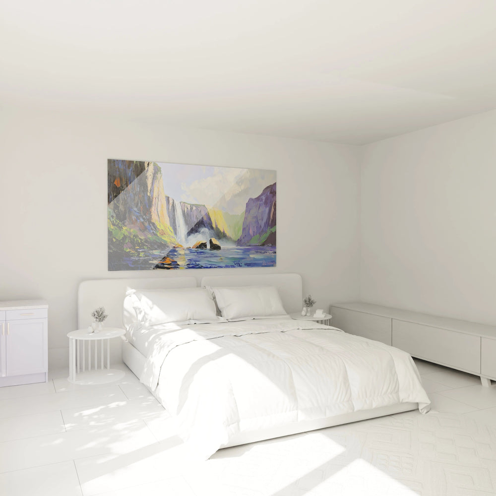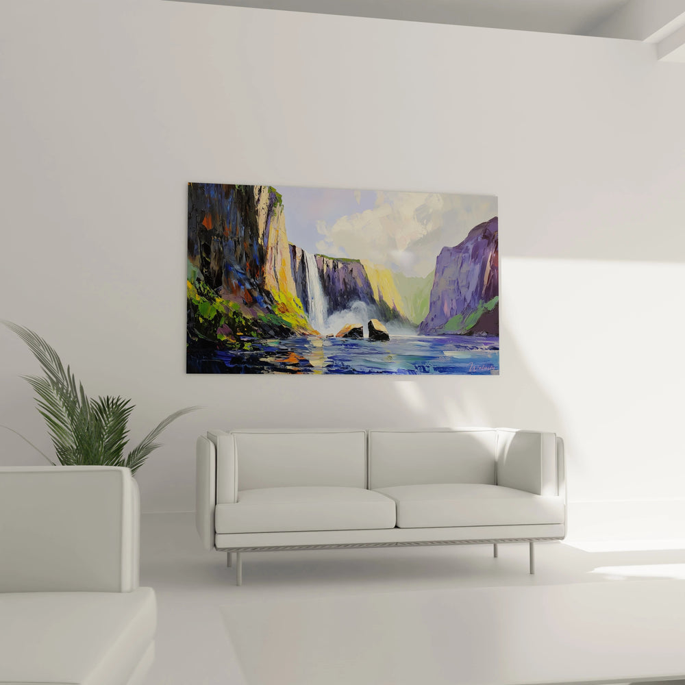 Grâce à une technique maîtrisée mêlant peinture au couteau et coups de pinceau visibles, le relief de la roche se fait presque palpable. Vous pourrez presque sentir la texture rugueuse des falaises violettes et bleues, là où la nature se fait sculpture vivante. La cascade, dynamique et lumineuse, crée une vibration optique intense, une danse entre fluidité et majesté qui anime votre espace.