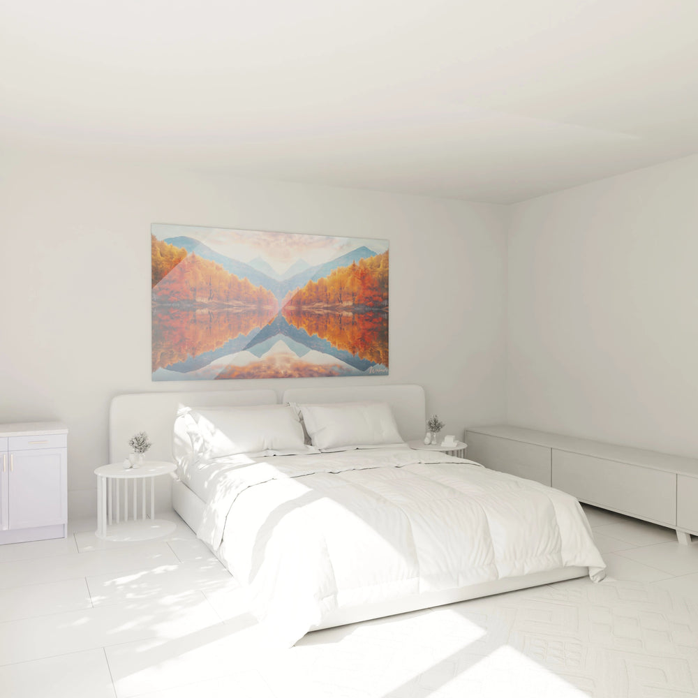 Ce tableau forêt automnal reflété est construit selon un principe de symétrie parfaite sur un axe horizontal. Le point focal se situe au centre exact de l'œuvre, là où les montagnes convergent pour former un "V" inversé dans le reflet. Les lignes directrices naturelles des contours montagneux guident le regard du spectateur vers le cœur de l'image, créant un mouvement visuel fluide et méditatif.