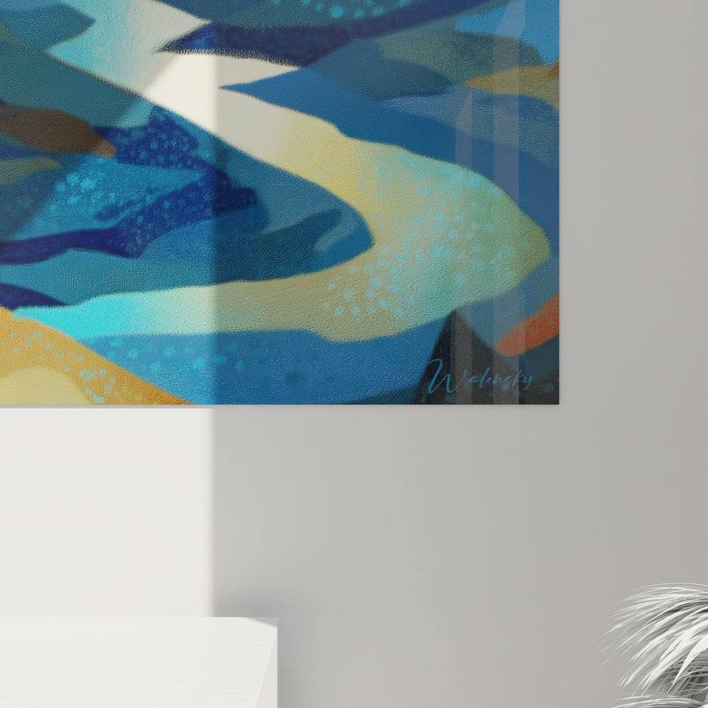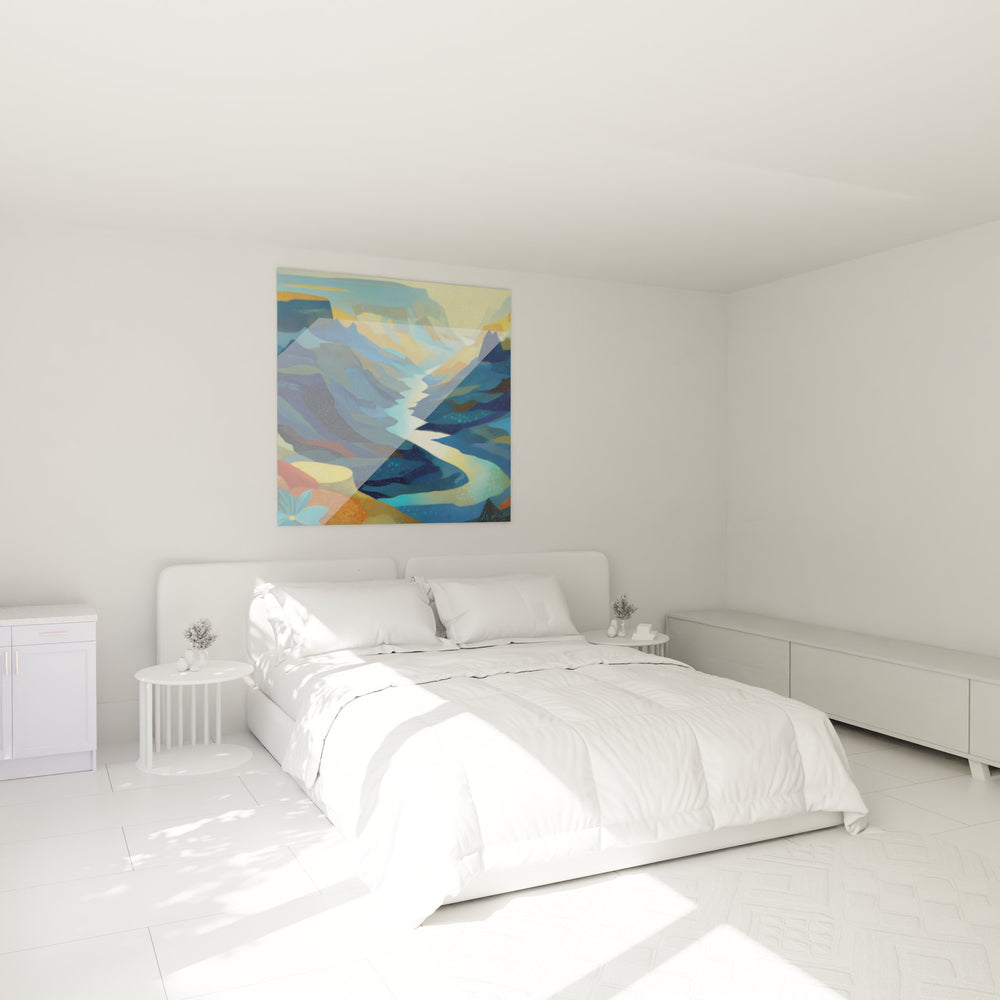 Ce tableau mural vallée montagneuse dévoile un paysage grandiose où une rivière serpentine traverse majestueusement un canyon aux reliefs escarpés. L'œuvre capture l'essence même des gorges profondes avec une composition dynamique qui guide naturellement le regard vers le centre de la toile. La peinture canyon contemporaine révèle des formations rocheuses stylisées aux multiples strates colorées, évoquant la géologie complexe de ces formations naturelles millénaires. Les montagnes stylisées s'élèvent de part et d'autre de la vallée, créant un effet de perspective saisissant qui amplifie la profondeur du canyon. Ce tableau gorges colorées transforme l'espace de vie en véritable galerie d'art contemporain, apportant une dimension poétique à la décoration murale. L'artiste a su retranscrire la grandeur de ces paysages de canyons artistiques en adoptant une approche moderne qui sublime les formes naturelles. Cette décoration murale nature s'intègre parfaitement dans les intérieurs contemporains, offrant une échappée visuelle vers des horizons infinis et des territoires sauvages préservés.