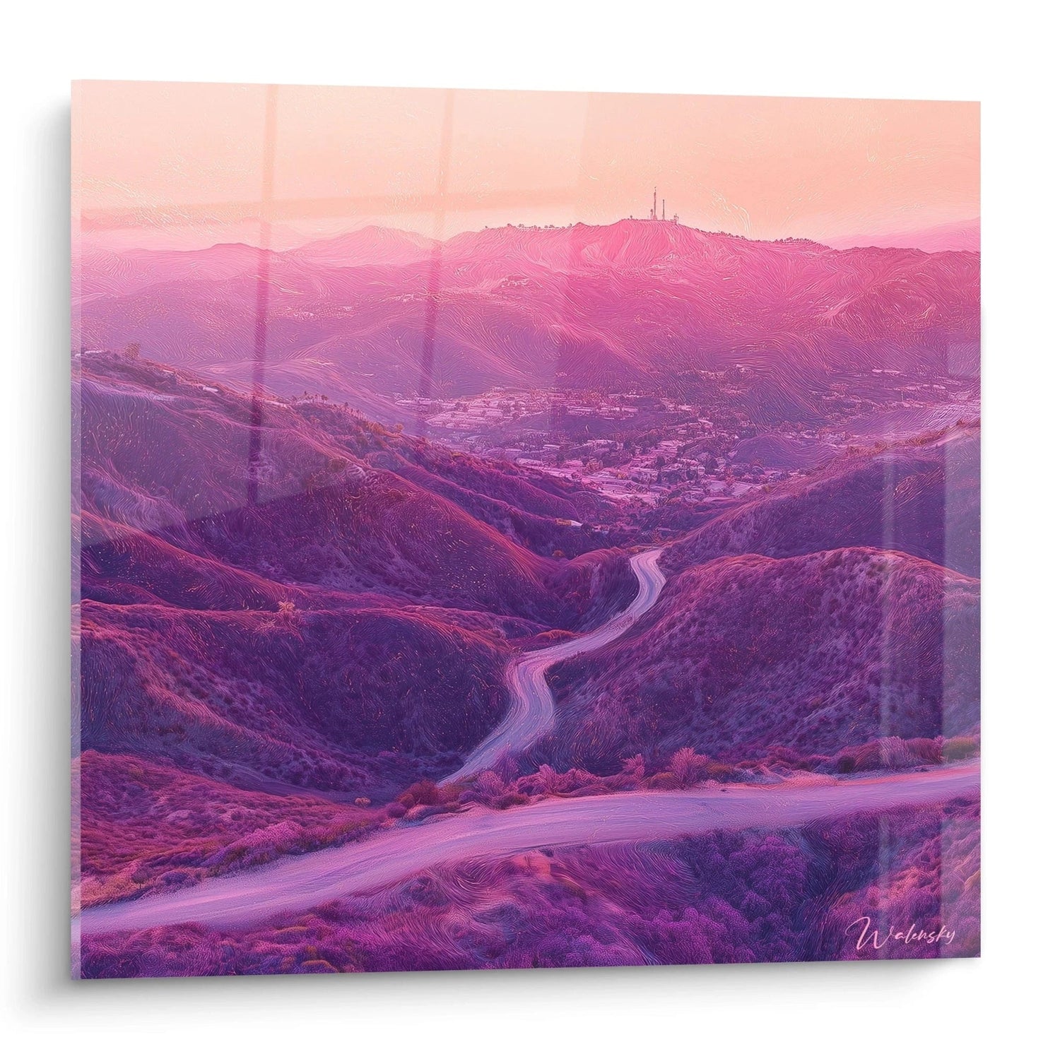 Ce tableau montagne captive immédiatement par son interprétation surréaliste d'un paysage alpin baigné dans des tons roses et violets extraordinaires. L'œuvre présente une vallée montagneuse vue en plongée, avec une route sinueuse qui serpente à travers les reliefs accidentés. La perspective aérienne offre une vision panoramique saisissante de cet environnement montagneux transformé par une palette chromatique envoûtante.