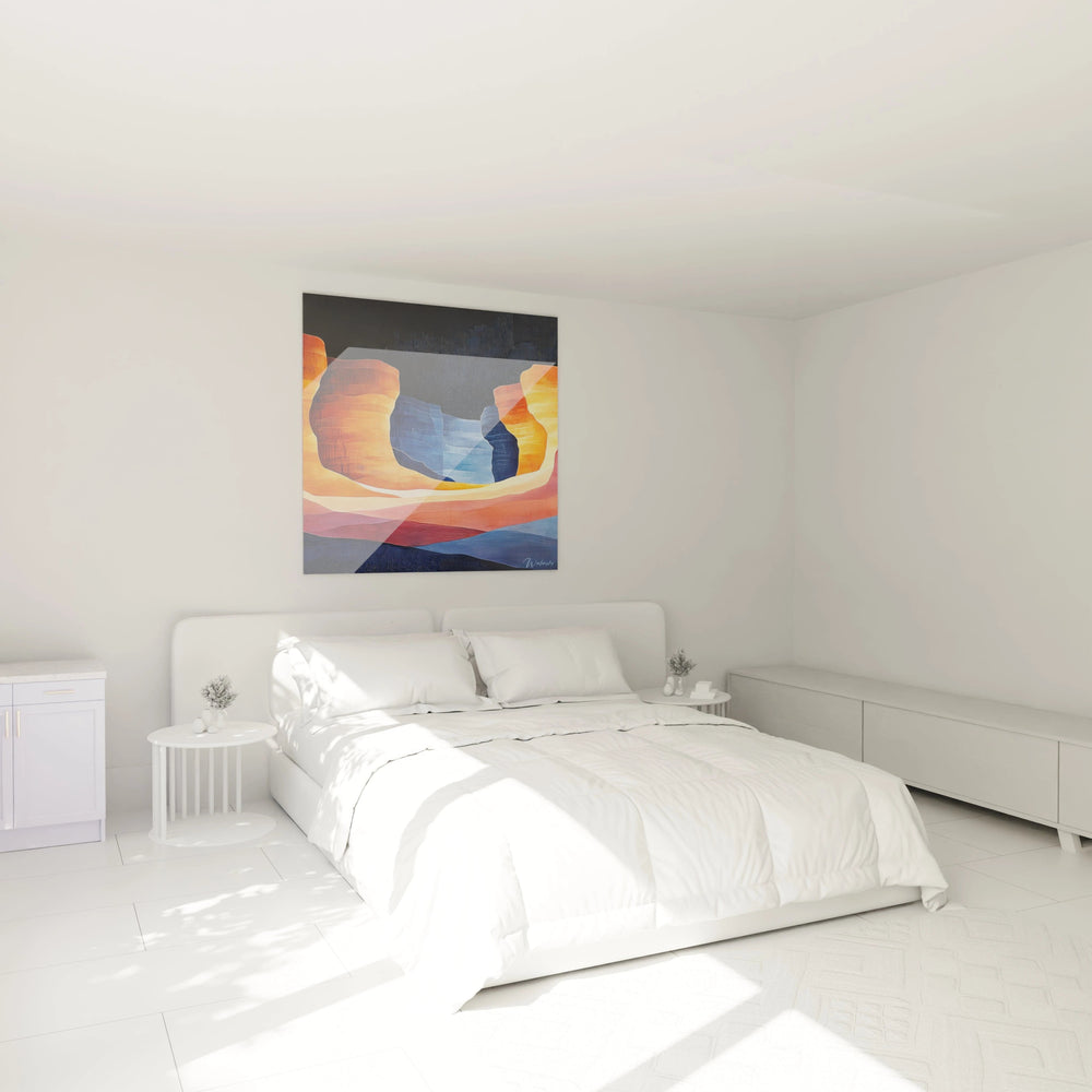 Ce tableau canyon captive instantanément par sa représentation saisissante des formations rocheuses stratifiées baignées dans une lumière chaude et contrastée. L'œuvre présente une vision moderne et épurée d'un canyon profond, où les parois orangées flamboyantes encadrent une crevasse bleue centrale. La composition évoque parfaitement l'immensité des paysages désertiques américains tout en proposant une interprétation artistique contemporaine des strates géologiques et du jeu de lumière qui les transforme.