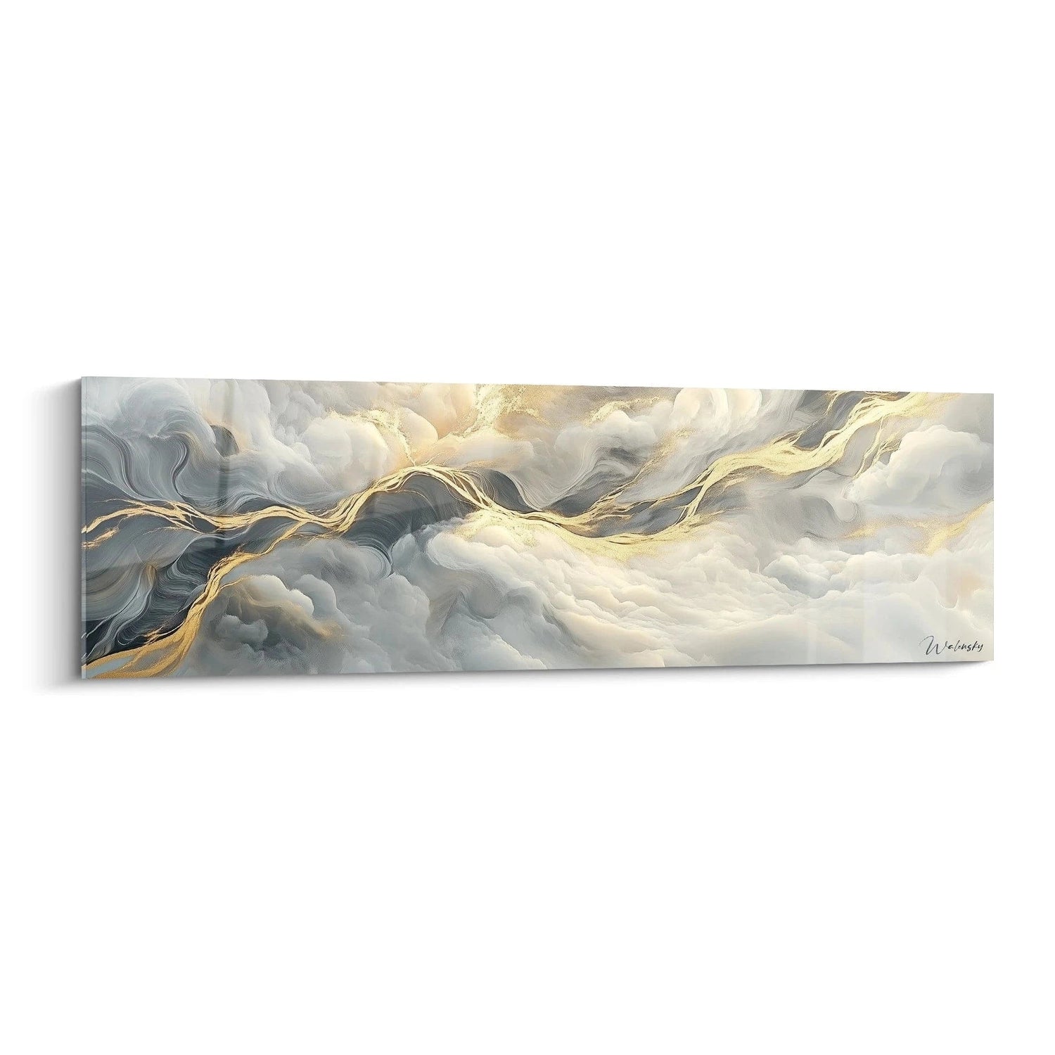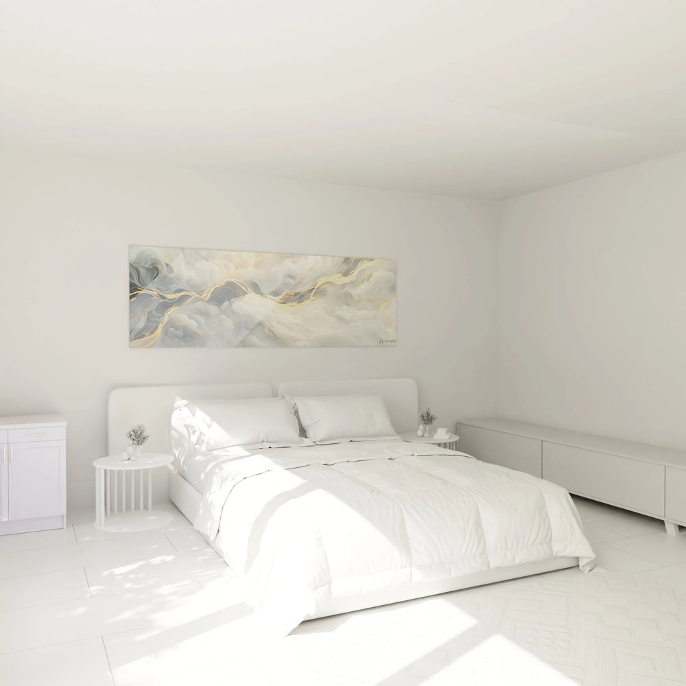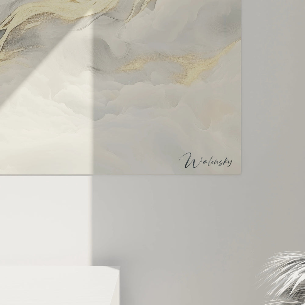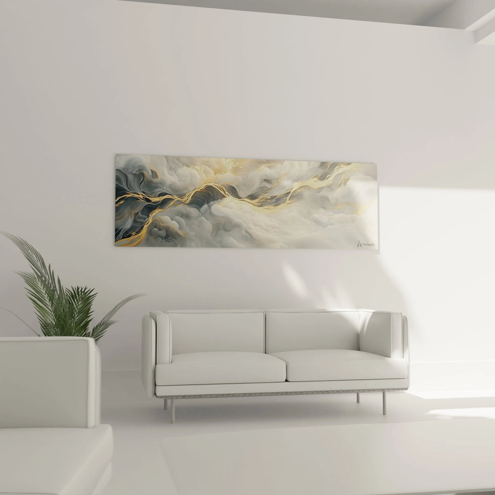 Ce tableau nuages contemporain révèle une composition abstraite exceptionnelle où se mêlent harmonieusement gris et or dans un ballet visuel captivant. L'œuvre présente des formations nuageuses stylisées qui évoluent dans un espace pictural dynamique, créant une atmosphère à la fois apaisante et mystérieuse. Les tableau nuages dorés fluides se déploient avec une élégance naturelle, guidant le regard à travers des courbes organiques et des transitions chromatiques subtiles. Cette décoration murale nuages contemporaine offre une expérience visuelle immersive qui transforme instantanément l'ambiance d'un espace. L'artiste a su capturer l'essence éphémère des formations célestes en leur donnant une permanence artistique remarquable.