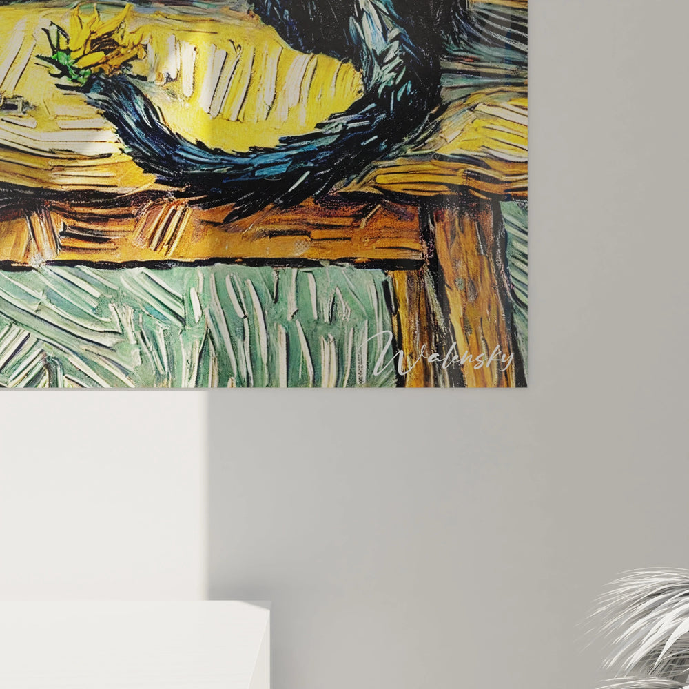 Née d’une inspiration puisée dans l’univers post-impressionniste, ce tableau honore la beauté brute et les émotions intenses tout en rendant hommage à la série iconique des tournesols. La touche mystérieuse du chat évoque une sensibilité profonde, rendant cette pièce idéale pour quiconque souhaite insuffler une note d’élégance et de poésie à son intérieur.