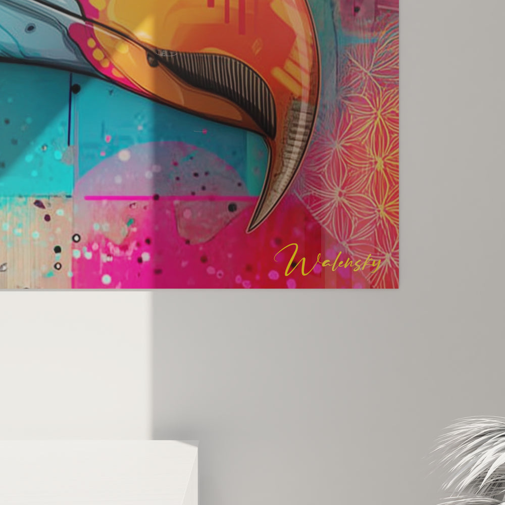 Ce tableau mural vautour présente une interprétation artistique saisissante d'un rapace stylisé dans un style art pop psychédélique. L'œuvre met en scène la tête majestueuse d'un vautour aux couleurs vibrantes, mêlant rose fuchsia, turquoise électrique, jaune citron et orange lumineux. Le tableau déco moderne révèle un travail minutieux sur les détails anatomiques, avec un œil perçant aux reflets dorés qui capte immédiatement l'attention. Les plumes sont représentées avec une précision remarquable, alternant entre zones texturées et aplats colorés. L'arrière-plan de cette œuvre d'art contemporaine combine des motifs géométriques, des formes organiques et des éléments graphiques qui créent un ensemble harmonieux et dynamique. Cette décoration murale animale s'inscrit dans la lignée du street art et de l'art numérique contemporain, offrant une vision moderne et audacieuse de la faune. Le bec imposant du vautour, traité dans des tons bleus et oranges, contraste magnifiquement avec les tons chauds du plumage. Cette toile art animalier moderne transformera instantanément votre espace en galerie d'art contemporain, apportant caractère et originalité à votre intérieur.