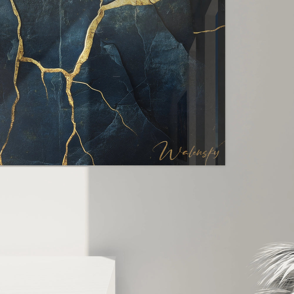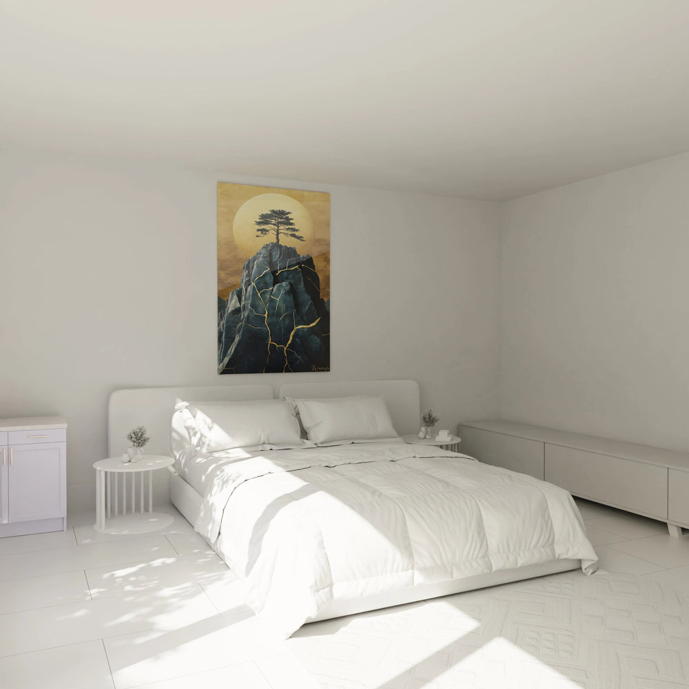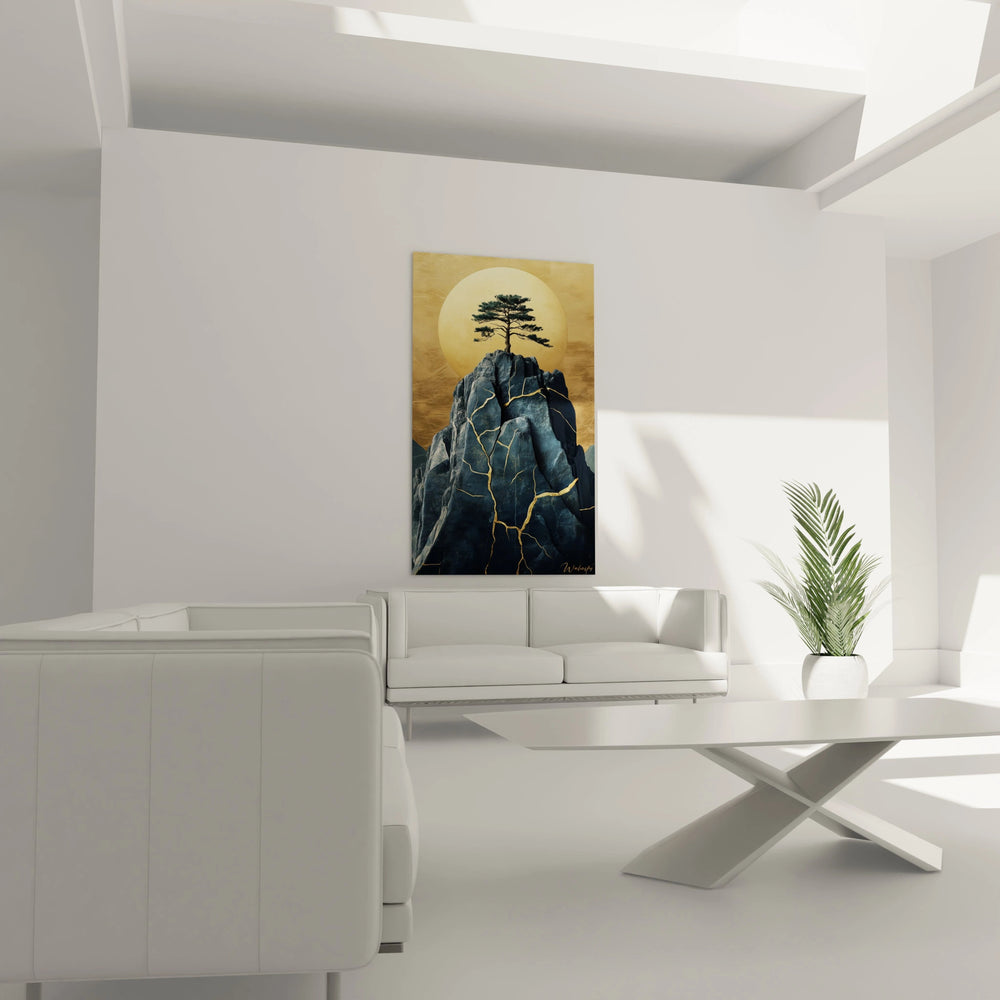Au centre de cette création, un pin solitaire s’ancre fermement sur une roche aux veines dorées, symbole puissant de la résistance face aux défis de la vie. Cette roche bleutée, marquée de fissures illuminées d’or grâce à un clin d’œil subtil au kintsugi, révèle la beauté née des cicatrices, capturant ainsi l’esprit japonais du wabi-sabi qui sublime l’éphémère et l’imparfait.