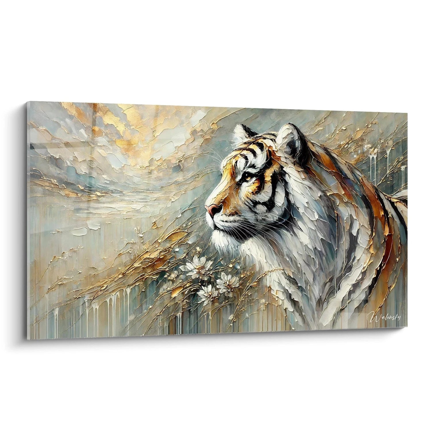 Ce tableau incarne l’alliance rare entre la puissance sauvage du tigre et la douceur enveloppante d’un univers onirique. Les nuances précieuses de doré illuminent la scène, évoquant un rayon de lumière divine qui caresse le pelage du tigre. Cette lueur dorée n’est pas qu’une simple teinte, elle symbolise la noblesse, la majesté et la profondeur d’une nature vibrante et protectrice.