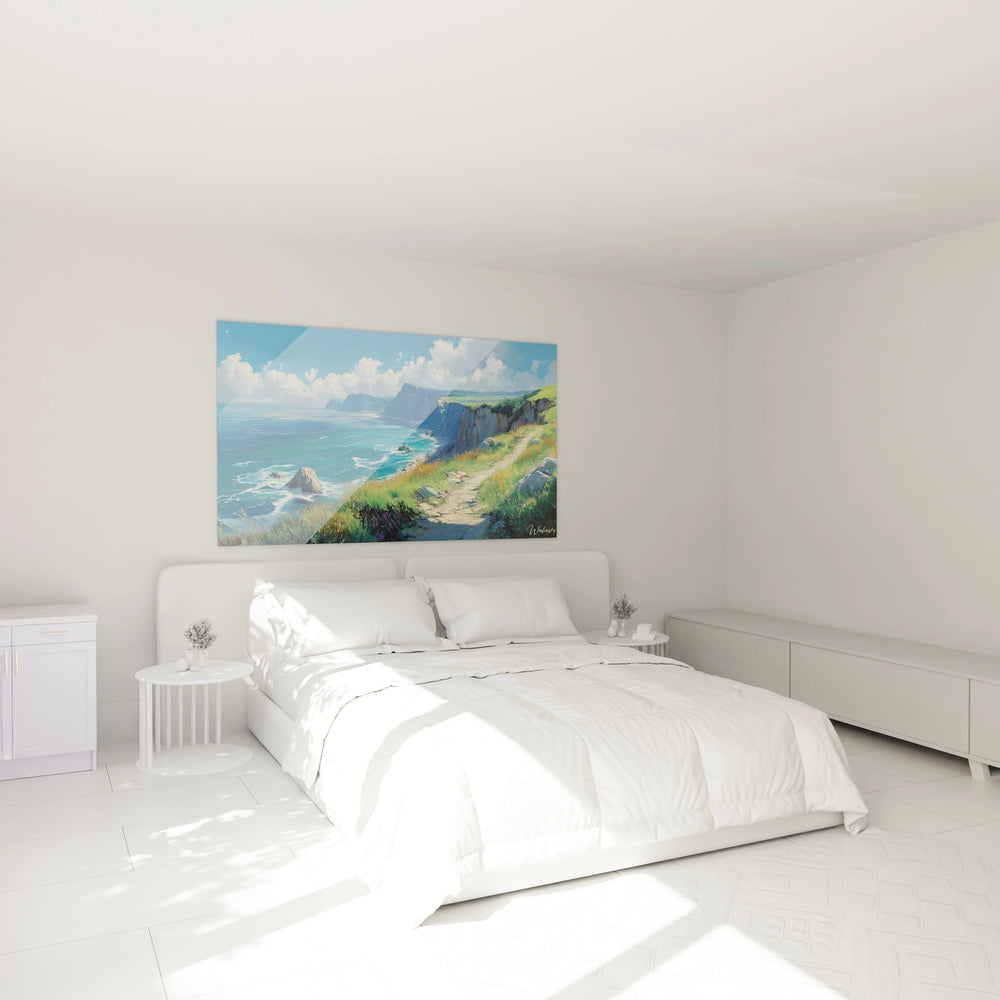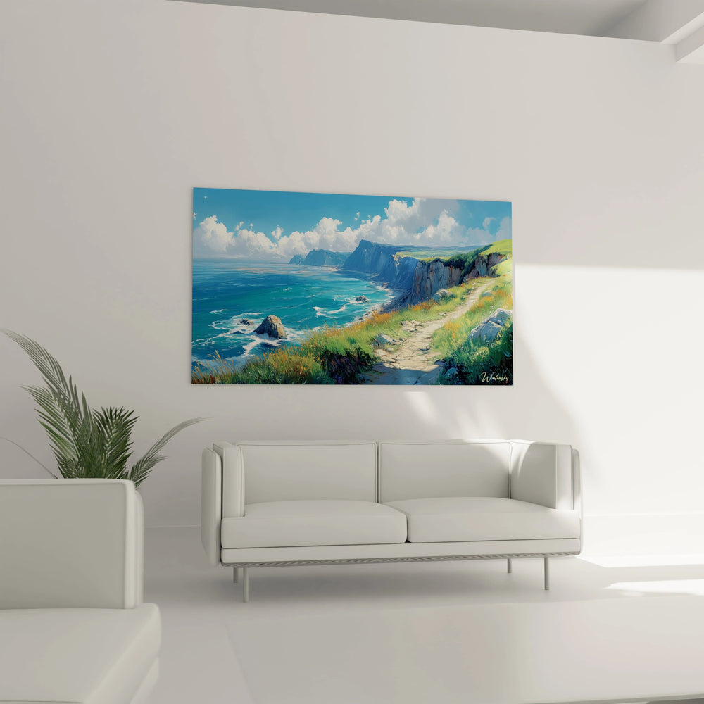 Ce tableau mer côtière captive immédiatement par sa représentation saisissante d'un littoral escarpé où falaises et océan se rencontrent dans une harmonie parfaite. L'œuvre présente un point de vue surélevé qui invite le spectateur à contempler l'immensité bleue depuis un sentier côtier serpentant à flanc de falaise. La première impression est celle d'une luminosité exceptionnelle, où le ciel azuré chargé de nuages cotonneux dialogue avec le turquoise profond de l'eau.