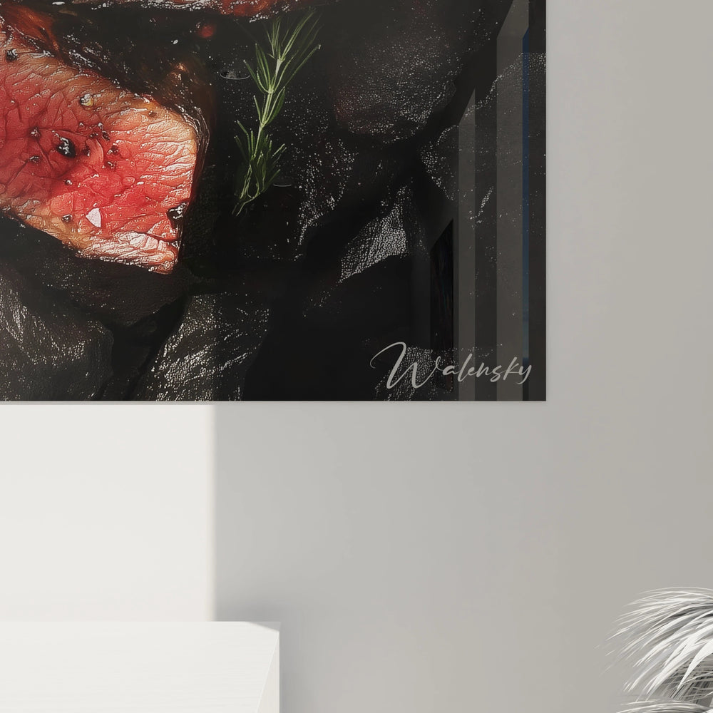Imaginez la chaleur d’un barbecue, la croûte caramélisée qui croustille sous la dent, la tendreté juteuse qui fond à chaque bouchée. Cette œuvre amène cette sensation dans votre salon ou votre cuisine, éveillant vos sens à travers un jeu maîtrisé de contrastes et de textures. Les nuances intenses de rouge, de marron profond et de noir charbonné dansent ensemble pour recréer la vitalité et la richesse d’une grillade d’exception.