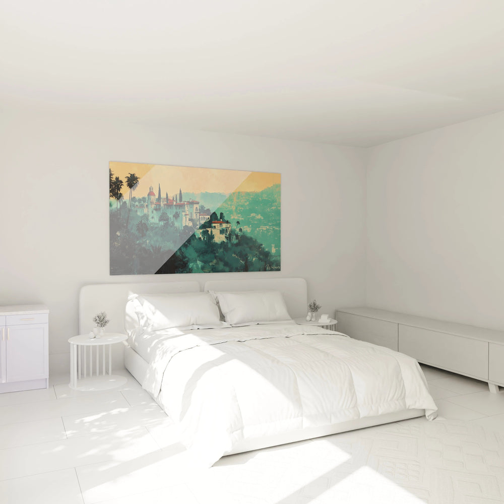 Conçu à partir d’une inspiration puisée lors d’un séjour le long des collines baignées par la brise marine, ce tableau évoque l’harmonie parfaite entre l’architecture et la nature luxuriante. Les villas blanches se dressent fièrement, adoucies par la végétation généreuse où palmiers et feuillages se mêlent avec élégance aux teintes chaleureuses du ciel crépusculaire. Le résultat ? Une composition où chaque détail, du jeu de lumière aux textures vibrantes, raconte une histoire d’élégance intemporelle et de calme absolu.