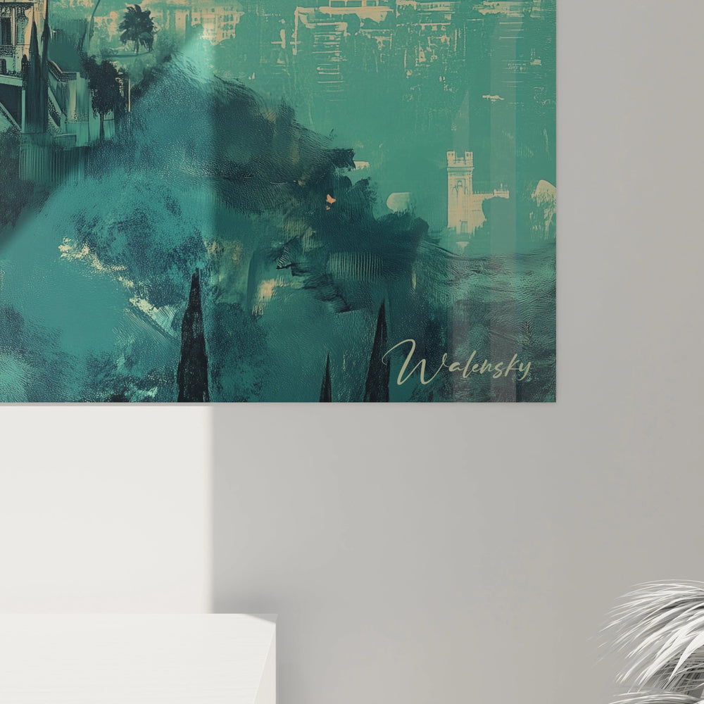 L'éclairage joue un rôle crucial dans la mise en valeur de ce tableau méditerranéen pastel. Un éclairage directionnel doux, idéalement avec une température de couleur chaude (environ 3000K), permettra d'accentuer la profondeur des contrastes sans créer de reflets indésirables. Pour compléter harmonieusement cette œuvre dans votre intérieur, privilégiez des meubles aux lignes épurées et des textiles dans des tons neutres ou reprenant discrètement le turquoise ou le terracotta présents dans le tableau. Cette décoration murale méditerranéenne s'accordera particulièrement bien avec des éléments naturels comme le bois clair, la pierre ou même quelques plantes d'intérieur soigneusement sélectionnées pour faire écho à l'atmosphère luxuriante du paysage représenté.