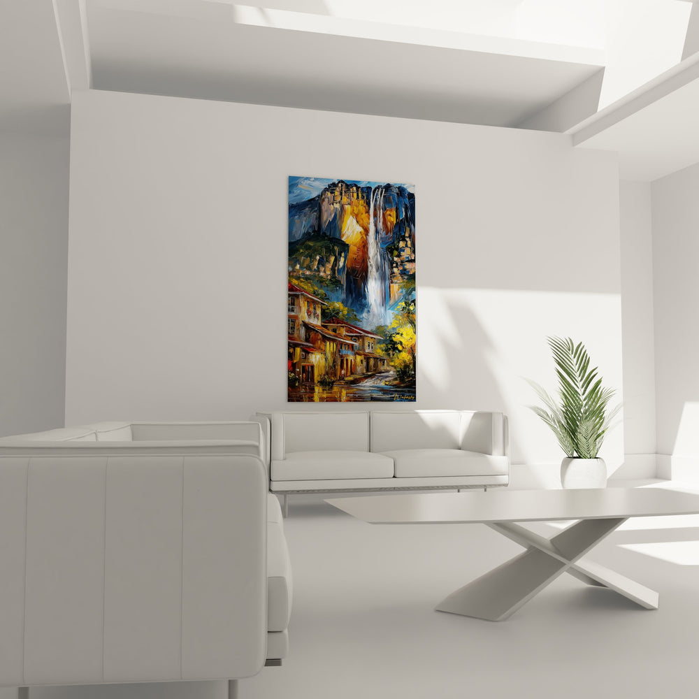 Tags : tableau cascade, paysage montagne, village alpin, décoration murale, art naturel
