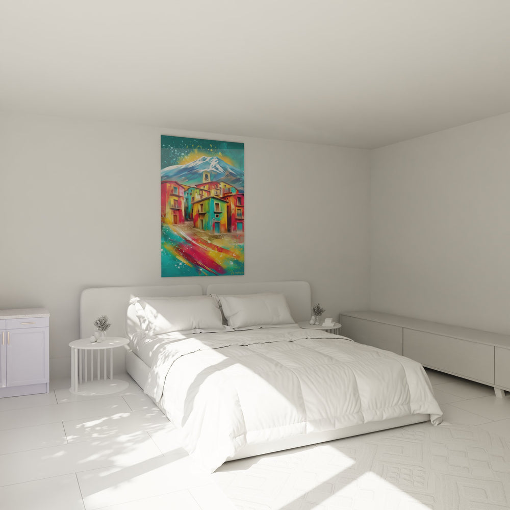 La palette chromatique explosive de ce tableau évoque l'harmonie entre la puissance tellurique du volcan et la vitalité humaine du village. Les couleurs chaudes dominent la composition, symbolisant la passion, l'énergie créatrice et la joie de vivre. Le contraste avec les tons froids du sommet enneigé représente l'équilibre entre forces naturelles et civilisation humaine, créant une décoration murale harmonieuse.