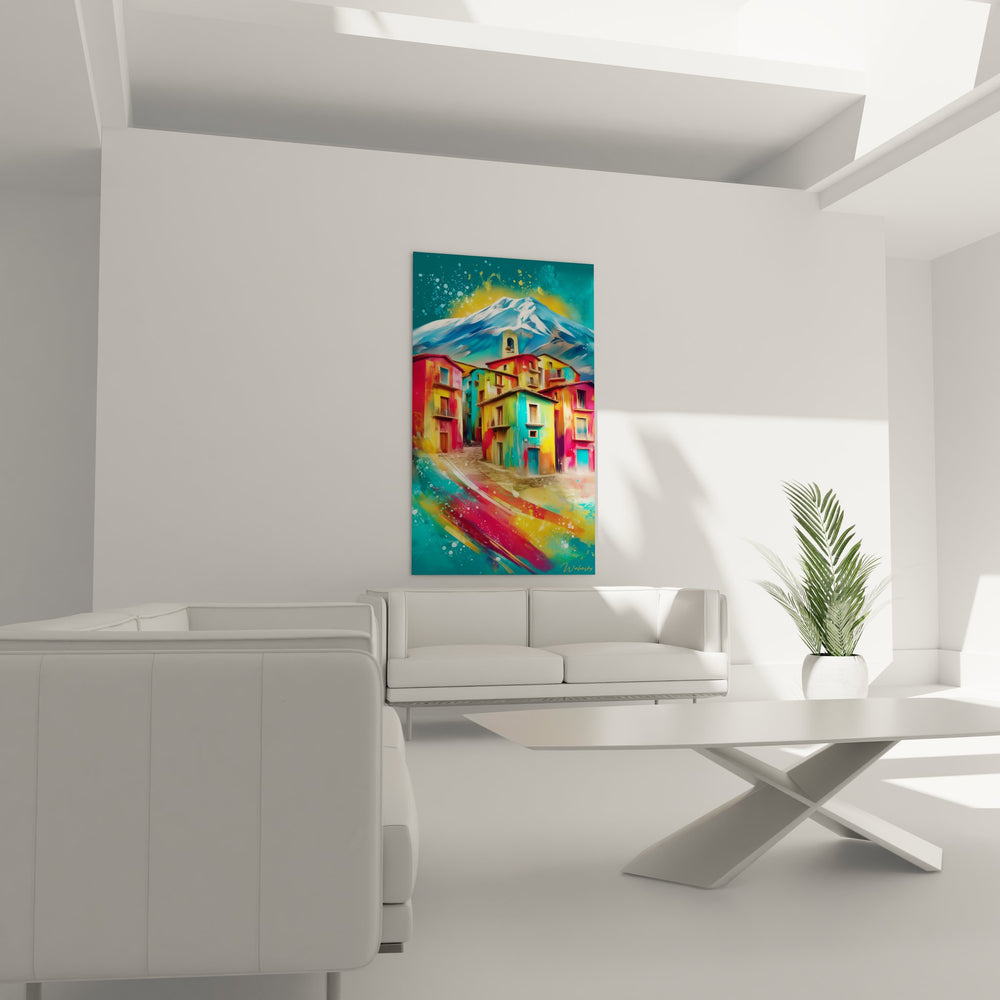 Ce tableau mural village coloré offre une vision artistique saisissante d'un petit bourg méditerranéen niché au pied d'un volcan enneigé majestueux. L'œuvre présente une composition harmonieuse où les maisons aux façades multicolores contrastent magnifiquement avec la blancheur immaculée du sommet volcanique. Chaque bâtiment arbore des teintes éclatantes - rouge vermillon, jaune solaire, turquoise profond, vert émeraude - créant une symphonie chromatique qui évoque la joie de vivre méditerranéenne. Le tableau décoratif moderne capture l'essence d'un village pittoresque avec ses ruelles pavées serpentant entre les habitations. Au centre, un clocher traditionnel s'élève fièrement, symbole de l'identité culturelle locale. L'artiste a su maîtriser la technique de l'éclaboussure colorée, donnant une dimension contemporaine à cette peinture murale paysage montagne. Les reflets dorés qui nimbe le volcan suggèrent un lever ou coucher de soleil, ajoutant une dimension poétique à l'ensemble. Cette œuvre d'art volcanique transformera instantanément votre espace en lui apportant chaleur, dynamisme et caractère méditerranéen authentique.