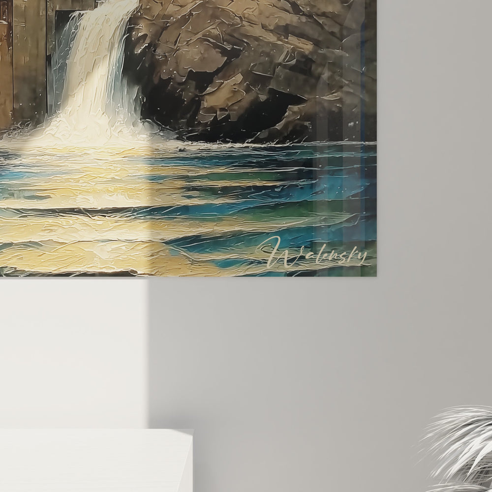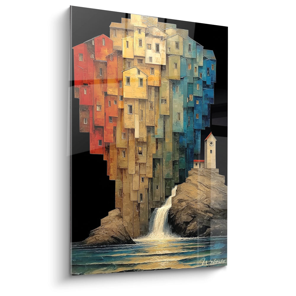 Ce tableau mural village coloré présente une composition saisissante d'habitations multicolores accrochées de manière vertigineuse à une falaise escarpée au bord de la mer. L'œuvre évoque immédiatement l'architecture emblématique des villages côtiers méditerranéens, particulièrement inspirée des célèbres Cinque Terre italiennes. Les maisons s'élèvent en cascade verticale, créant un paysage urbain spectaculaire où chaque bâtiment semble défier les lois de la gravité. La technique picturale révèle un travail minutieux sur les textures architecturales, avec des détails soignés pour chaque fenêtre, balcon et escalier qui serpentent entre les habitations. Une cascade naturelle jaillit dramatiquement de la base rocheuse, se déversant dans les eaux turquoise qui reflètent la lumière dorée du soleil couchant. Ce tableau décoratif maritime capture parfaitement l'harmonie entre l'architecture humaine et la nature sauvage, créant une œuvre d'art murale qui invite au voyage et à l'évasion. La composition verticale accentue la monumentalité de cette cité imaginaire suspendue, transformant l'espace décoratif en fenêtre ouverte sur un monde de rêve méditerranéen.