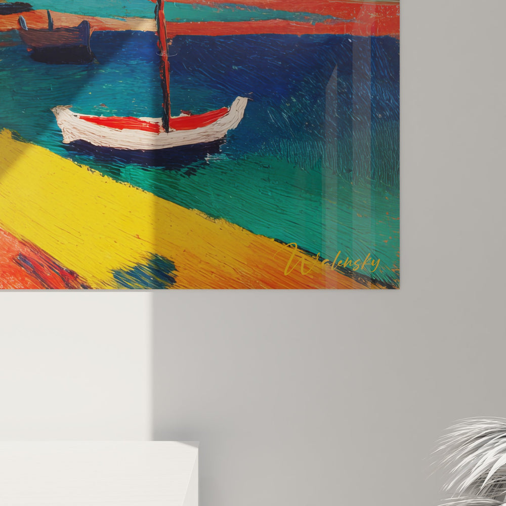 Cette création artistique maritime s'inspire du mouvement fauve et de l'expressionnisme, rappelant les œuvres d'André Derain à Collioure ou les paysages colorés de Raoul Dufy. L'utilisation libre de la couleur et l'expression spontanée des formes font écho aux grands maîtres qui ont révolutionné la peinture de paysage côtier. Cette approche moderne du tableau décoratif nautique perpétue la tradition de l'art méditerranéen contemporain.