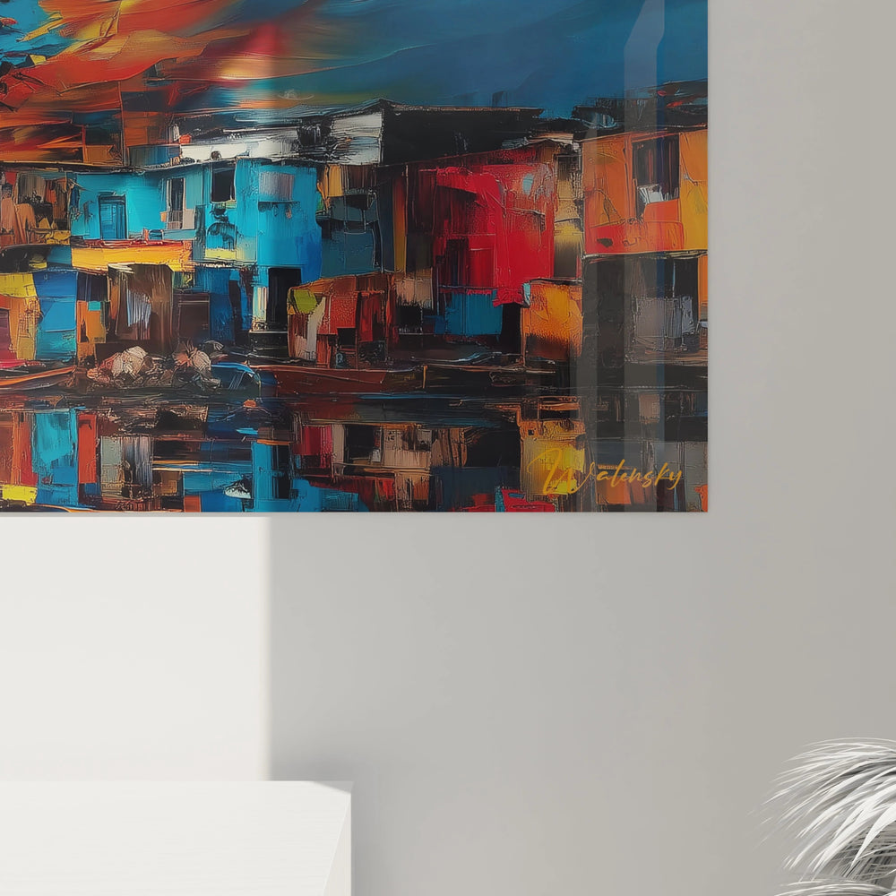 L'expérience visuelle de ce tableau village perspective profonde évolue selon la distance d'observation, révélant différentes strates de lecture. À distance, l'œuvre frappe par sa puissance chromatique globale et l'équilibre de sa composition panoramique. L'approche révèle progressivement la richesse des détails architecturaux : fenêtres, portes, variations de textures murales qui témoignent de la vie quotidienne des habitants. L'examen rapproché dévoile la subtilité du travail sur les reflets aquatiques, où chaque ondulation de l'eau déforme délicatement l'image des constructions. Cette tableau village details minutieux récompense l'attention portée à sa contemplation, chaque nouvelle observation révélant des nuances chromatiques ou des détails narratifs précédemment inaperçus. L'effet global conserve néanmoins sa force d'impact, cette art mural village impressionnant fonctionnant à tous les niveaux de lecture visuelle.