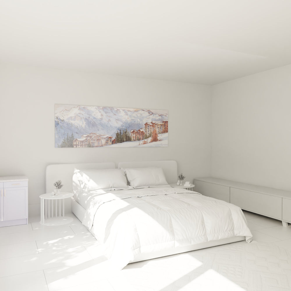 La palette chromatique de ce tableau montagne panoramique évoque la quiétude et l'harmonie des paysages alpins enneigés. Les blancs immaculés de la neige symbolisent la pureté et la sérénité, tandis que les tons chauds des chalets représentent le refuge et la convivialité humaine face à la grandeur de la nature. Les bleus nuancés des montagnes incarnent la majesté et l'éternité des sommets, créant une composition équilibrée qui inspire la paix intérieure.