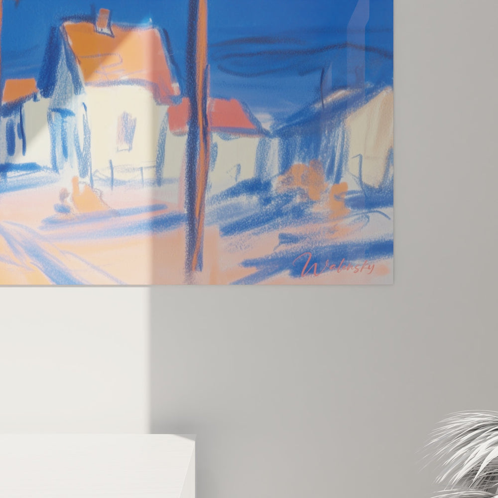 Ce tableau village désert capture avec une intensité remarquable l'atmosphère unique d'un petit hameau perdu dans l'immensité aride. L'artiste a su créer une œuvre d'art murale désertique qui évoque la solitude majestueuse des terres désolées. Les maisons aux toits orangés se détachent contre un ciel d'un bleu profond, créant un contraste saisissant qui caractérise ce tableau mural paysage aride. Les poteaux électriques qui traversent la composition rappellent la modernité qui s'immisce dans ces territoires reculés. Cette peinture village isolé révèle la beauté brute des étendues désertes, où chaque habitation devient un refuge précieux contre l'hostilité de l'environnement. L'utilisation de la technique mixte confère à cette décoration murale thème désert une texture particulière qui amplifie l'émotion véhiculée. Les ombres projetées par les bâtiments suggèrent la chaleur accablante du jour qui s'achève, tandis que les tons chauds évoquent les derniers rayons du soleil. Ce tableau art contemporain désert s'inscrit dans une démarche artistique moderne qui revisite les codes de la peinture de paysage traditionnel, offrant une vision contemporaine des espaces désolés.