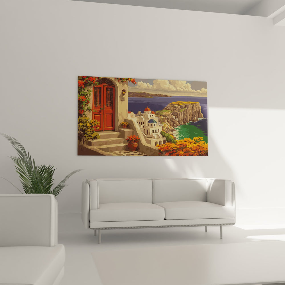 Ce tableau mural village grec capture avec une précision saisissante l'essence des îles grecques et leur architecture emblématique. L'œuvre dépeint une scène idyllique où une porte rouge traditionnelle ornée de ferronneries s'ouvre sur un panorama spectaculaire de la mer Égée. Les maisons blanches aux toits bleus caractéristiques de l'architecture cycladique se déploient en cascade le long des falaises escarpées, créant une harmonie parfaite avec le paysage rocheux. Ce tableau décoratif méditerranéen révèle chaque détail avec une précision remarquable : les escaliers de pierre patinés par le temps, les bougainvilliers colorés qui grimpent le long des murs ocre, et les poteries en terre cuite débordantes de fleurs. La perspective artistique guide le regard depuis le premier plan intime vers l'horizon infini, où les nuages dorés se reflètent sur les eaux turquoise. Cette œuvre d'art murale évoque parfaitement l'atmosphère sereine et ensoleillée des archipels grecs, transformant tout espace en invitation au voyage. Les textures naturelles de la pierre, du bois et de la végétation méditerranéenne sont rendues avec un réalisme qui invite à la contemplation et à l'évasion.