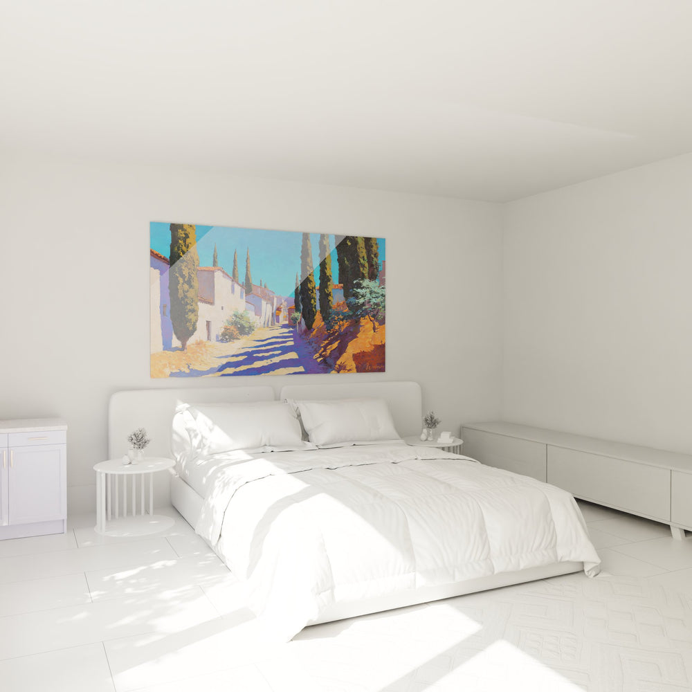 Ce tableau mural village méditerranéen capture avec une remarquable authenticité l'essence d'une rue provençale ensoleillée bordée de majestueux cyprès. L'artiste a magistralement représenté l'architecture typique de la région avec ses maisons blanches aux toits de tuiles rouges, créant un contraste saisissant avec le bleu profond du ciel méditerranéen. Les cyprès élancés se dressent fièrement le long du chemin pavé, leurs silhouettes sombres créant un jeu d'ombres et de lumière caractéristique du paysage provençal. Cette peinture de campagne française révèle une technique picturale sophistiquée où chaque coup de pinceau contribue à l'atmosphère chaleureuse et accueillante du village. Le tableau décoratif méditerranéen transporte immédiatement l'observateur dans cette ambiance paisible où le temps semble suspendu. Les détails architecturaux, des volets colorés aux murs patinés par le soleil, témoignent d'une observation minutieuse de la campagne provençale traditionnelle. Cette œuvre d'art murale constitue une véritable invitation au voyage, évoquant les senteurs de lavande et le chant des cigales qui caractérisent cette région emblématique de France.