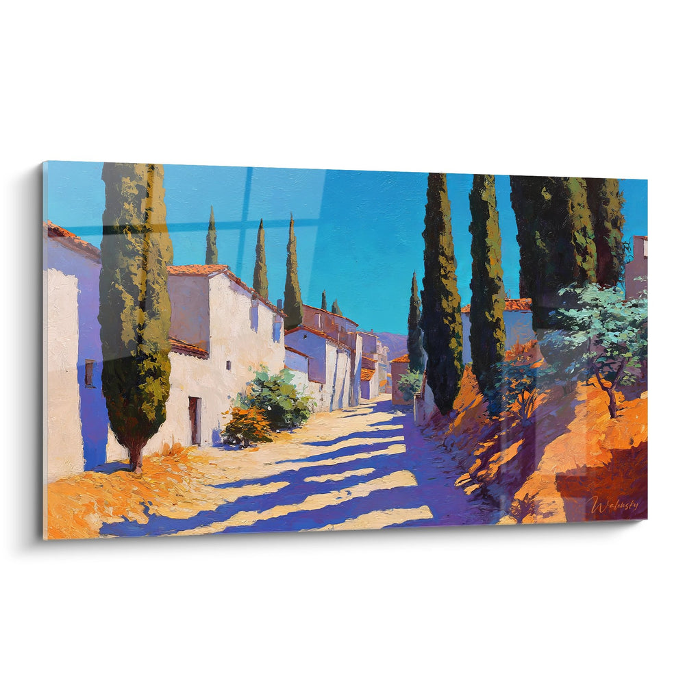 Éveillez vos sens et transformez votre intérieur avec ce magnifique tableau village méditerranéen, représentant une luxuriante rue ensoleillée de Provence. Ce chef-d'œuvre capture l'essence de la vie provençale, où chaque coup de pinceau vous transporte au cœur d'un village baigné de lumière, où les cyprès se dressent fièrement contre un ciel azur. Imaginez-vous en train de flâner dans cette rue, les arômes des herbes et des fleurs d'été chatouillant vos narines, tout en écoutant le doux murmure du vent entre les feuilles.