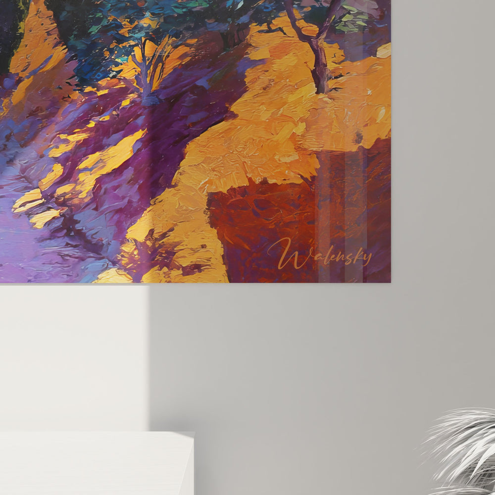 La palette chromatique méditerranéenne de ce tableau révèle une harmonie parfaite entre les tons chauds et froids. Les ocres, oranges et jaunes dorés évoquent la chaleur du soleil provençal, tandis que les bleus profonds du ciel et les violets des ombres apportent fraîcheur et profondeur. Cette composition coloriste symbolise l'équilibre entre l'énergie solaire et la sérénité méditerranéenne, créant une ambiance à la fois dynamique et apaisante.