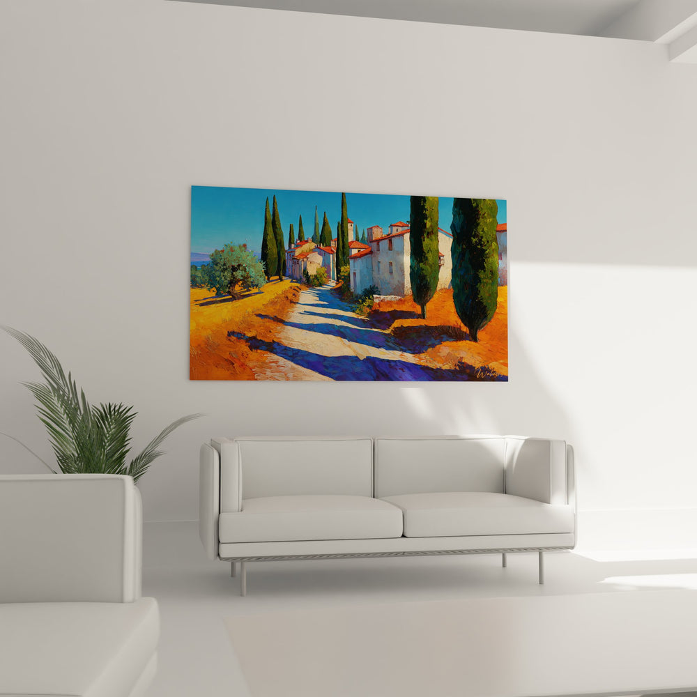 Ce magnifique tableau village méditerranéen capture l'essence même de la campagne provençale avec une palette de couleurs vibrantes et chaleureuses. L'œuvre dépeint un pittoresque village méditerranéen niché entre des cyprès élancés, où les maisons aux murs ocre et blancs se dressent sous un ciel d'azur. Le chemin de terre serpente à travers la composition, créant une perspective naturelle qui guide le regard vers les habitations typiques aux toits de tuiles rouges. Les cyprès de Provence se dressent majestueusement, leurs silhouettes sombres contrastant avec la luminosité dorée du paysage. Cette peinture de campagne révèle un savoir-faire artistique remarquable dans le traitement de la lumière méditerranéenne, où chaque ombre bleue et violet apporte une profondeur saisissante. L'artiste a su capturer l'atmosphère paisible d'un paysage rural méditerranéen, où la nature et l'architecture se fondent harmonieusement. Ce tableau mural campagne transformera votre intérieur en lui apportant la douceur et l'authenticité des terres du Sud.